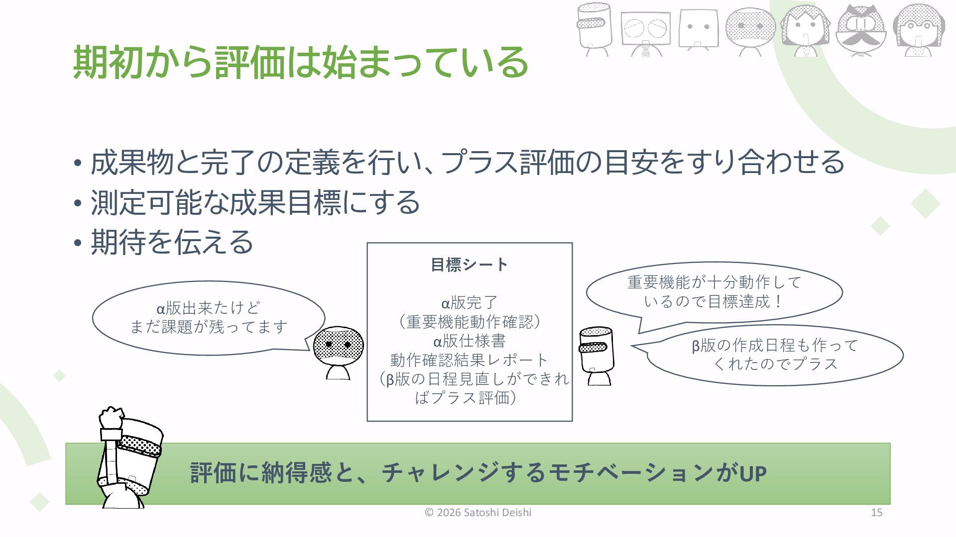 9. 期初から評価は始まっている • 成果物と完了の定義を行い、プラス評価の目安をすり合わせる • 測定可能な成果目標にする • 期待を伝える © 2026 Satoshi