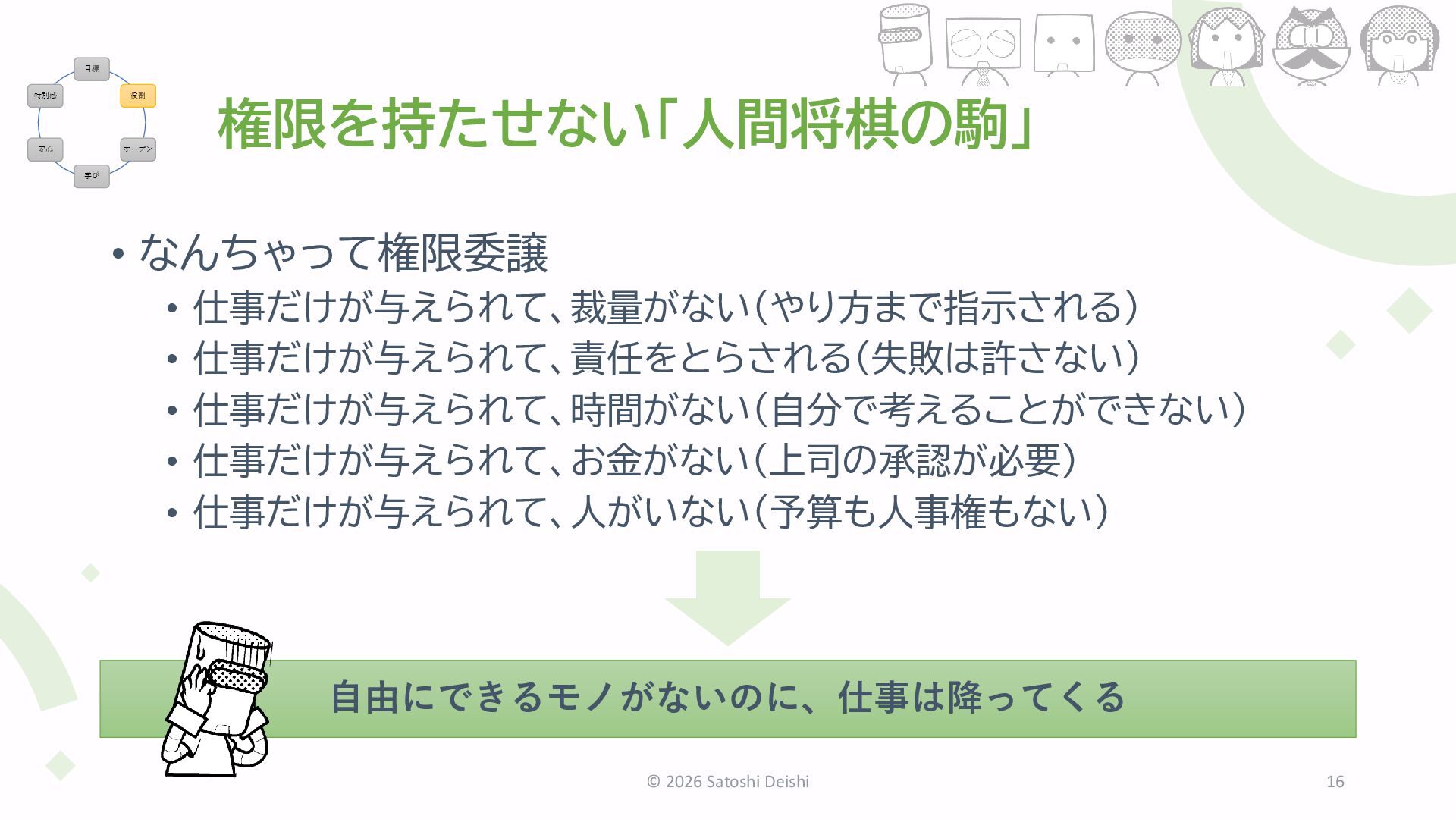 仕事だけが与えられて、お金がない(上司の承認が必要) • 仕事だけが与えられて、人がいない(予算も人事権もない) © 2026 Satoshi Deishi 16 目標 役割 オープン 学び 安心 特別感 自由にできるモノがないのに、仕事は降ってくる