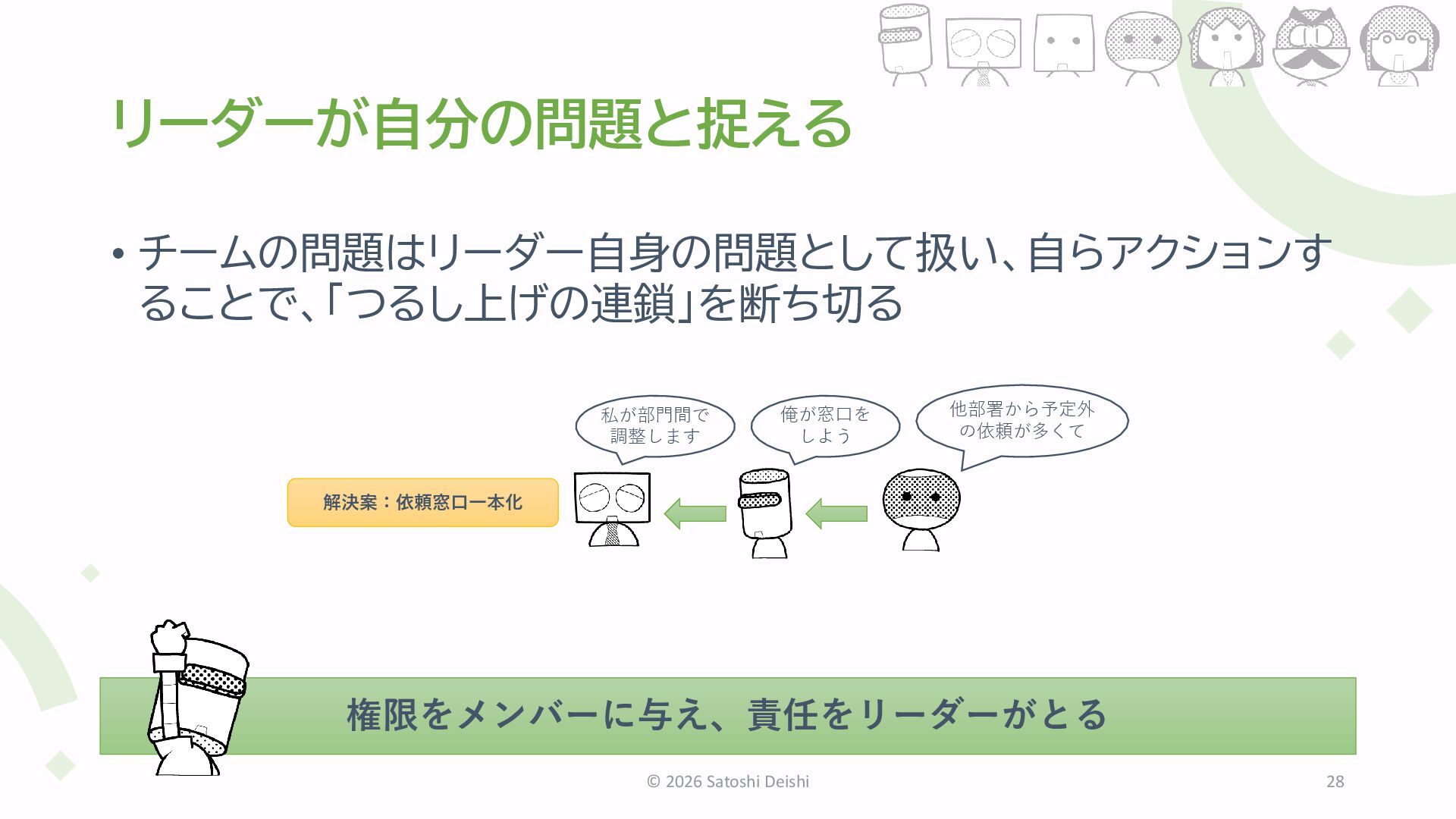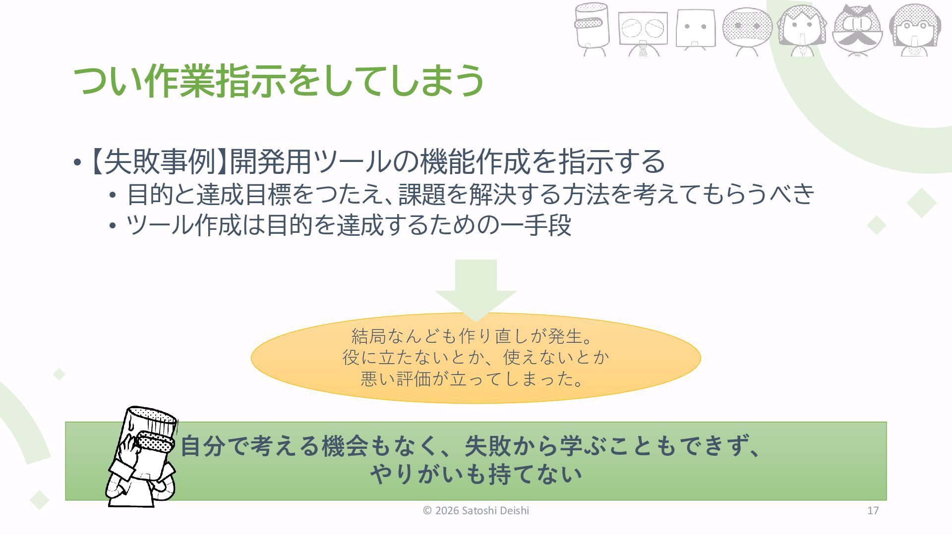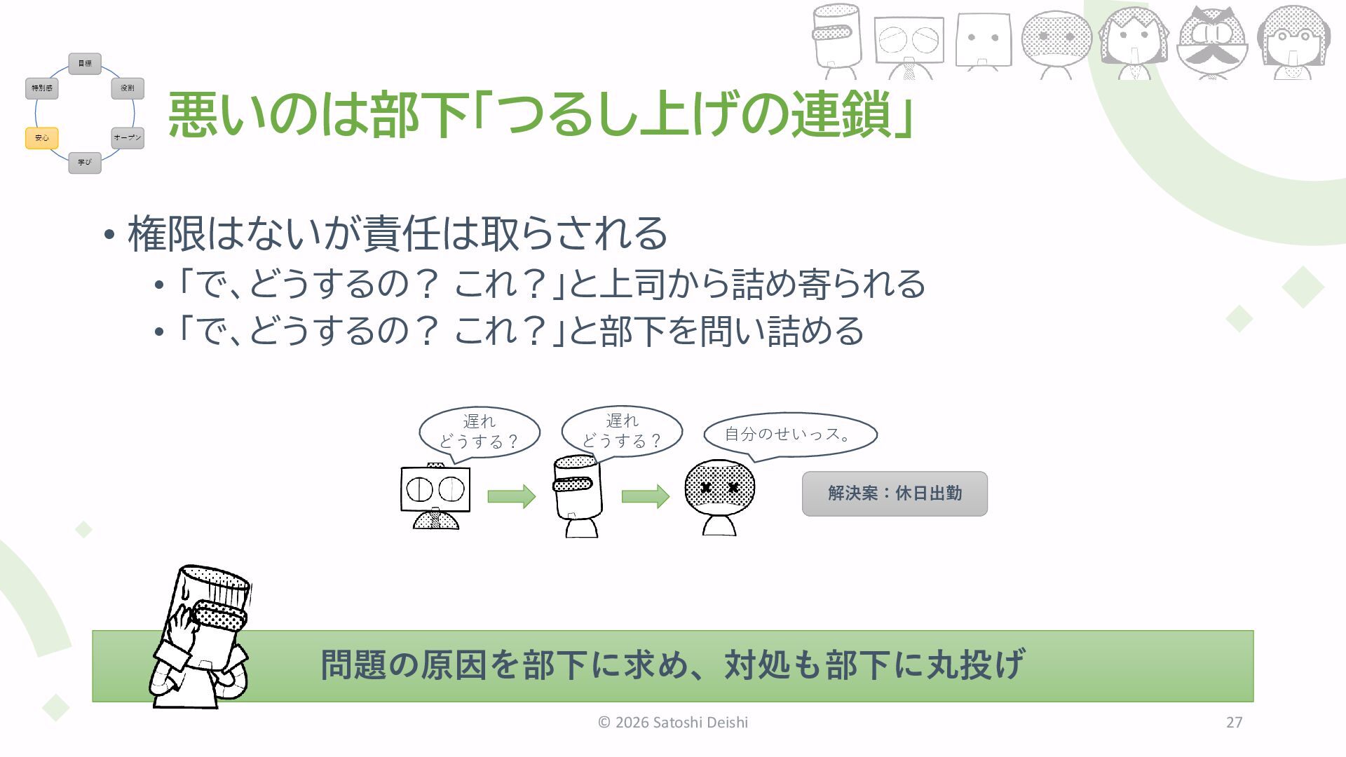 2026 Satoshi Deishi 27 目標 役割 オープン 学び 安心 特別感 問題の原因を部下に求め、対処も部下に丸投げ 遅れ どうする? 自分のせいっス。 解決案:休日出勤 遅れ どうする?