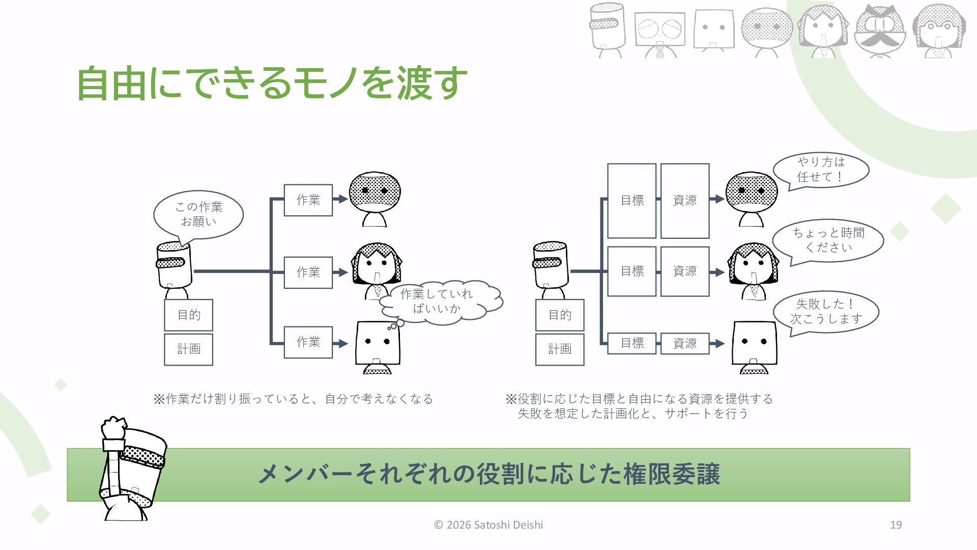 12. 自由にできるモノを渡す © 2026 Satoshi Deishi 19 メンバーそれぞれの役割に応じた権限委譲 作業 作業 作業
