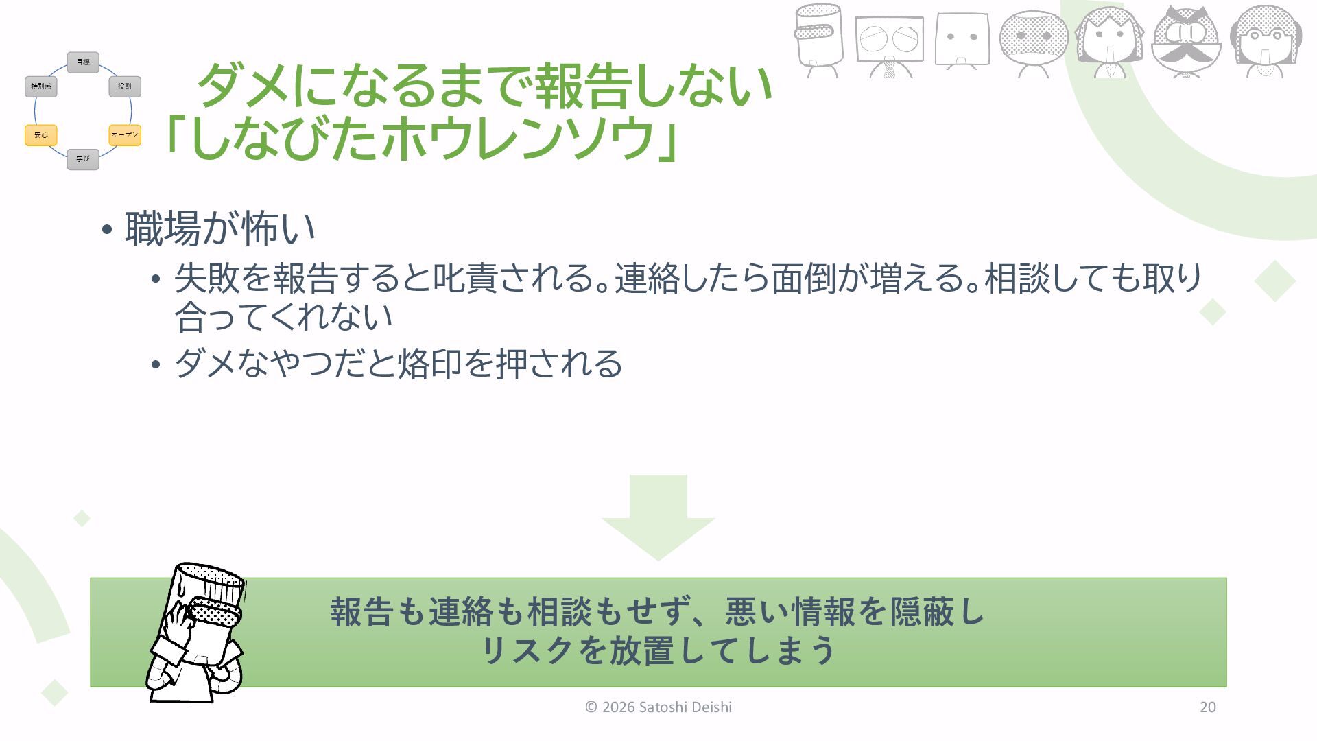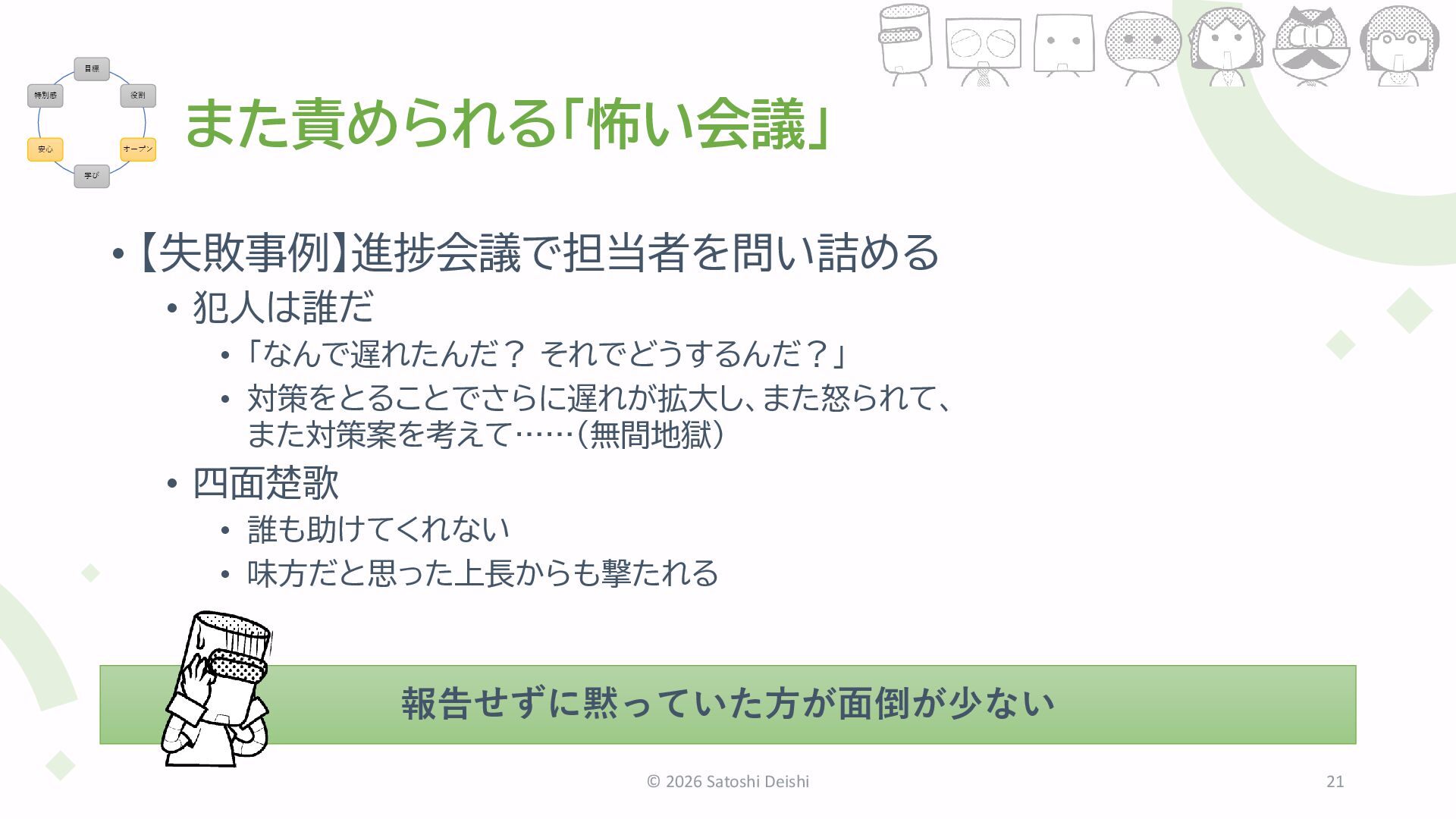 また対策案を考えて……(無間地獄) • 四面楚歌 • 誰も助けてくれない • 味方だと思った上長からも撃たれる © 2026 Satoshi Deishi 21 報告せずに黙っていた方が面倒が少ない 目標 役割 オープン 学び 安心 特別感