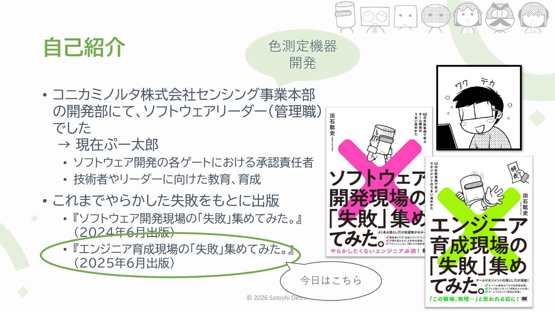 技術者やリーダーに向けた教育、育成 • これまでやらかした失敗をもとに出版 • 『ソフトウェア開発現場の「失敗」集めてみた。』 (2024年6月出版) • 『エンジニア育成現場の「失敗」集めてみた。』 (2025年6月出版) © 2026 Satoshi Deishi 3 色測定機器 開発 今日はこちら
