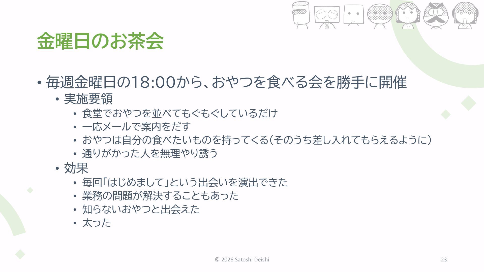 おやつは自分の食べたいものを持ってくる(そのうち差し入れてもらえるように) • 通りがかった人を無理やり誘う • 効果 • 毎回「はじめまして」という出会いを演出できた • 業務の問題が解決することもあった • 知らないおやつと出会えた • 太った © 2026 Satoshi Deishi 23