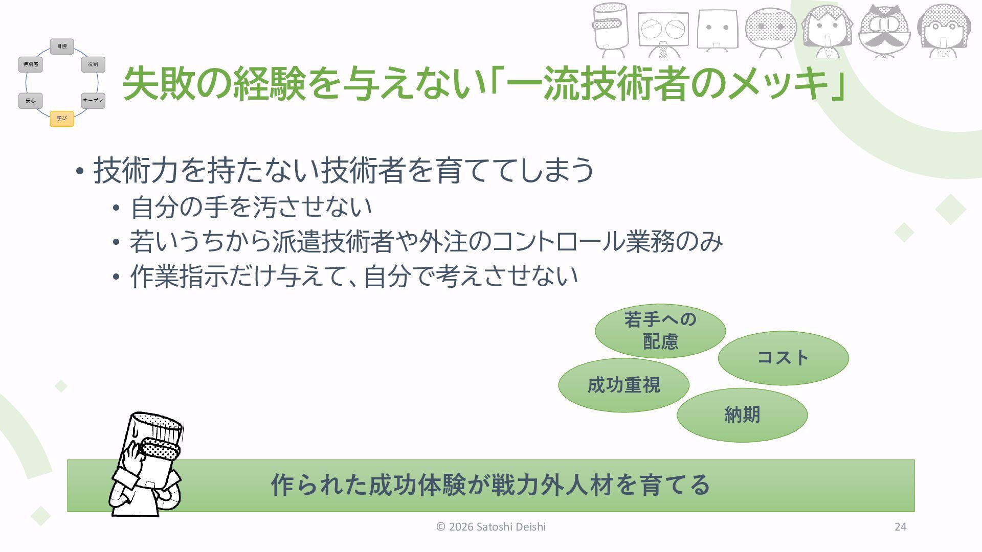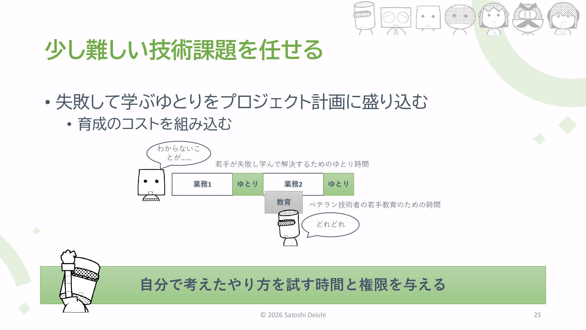 16. 少し難しい技術課題を任せる • 失敗して学ぶゆとりをプロジェクト計画に盛り込む • 育成のコストを組み込む © 2026 Satoshi Deishi 25