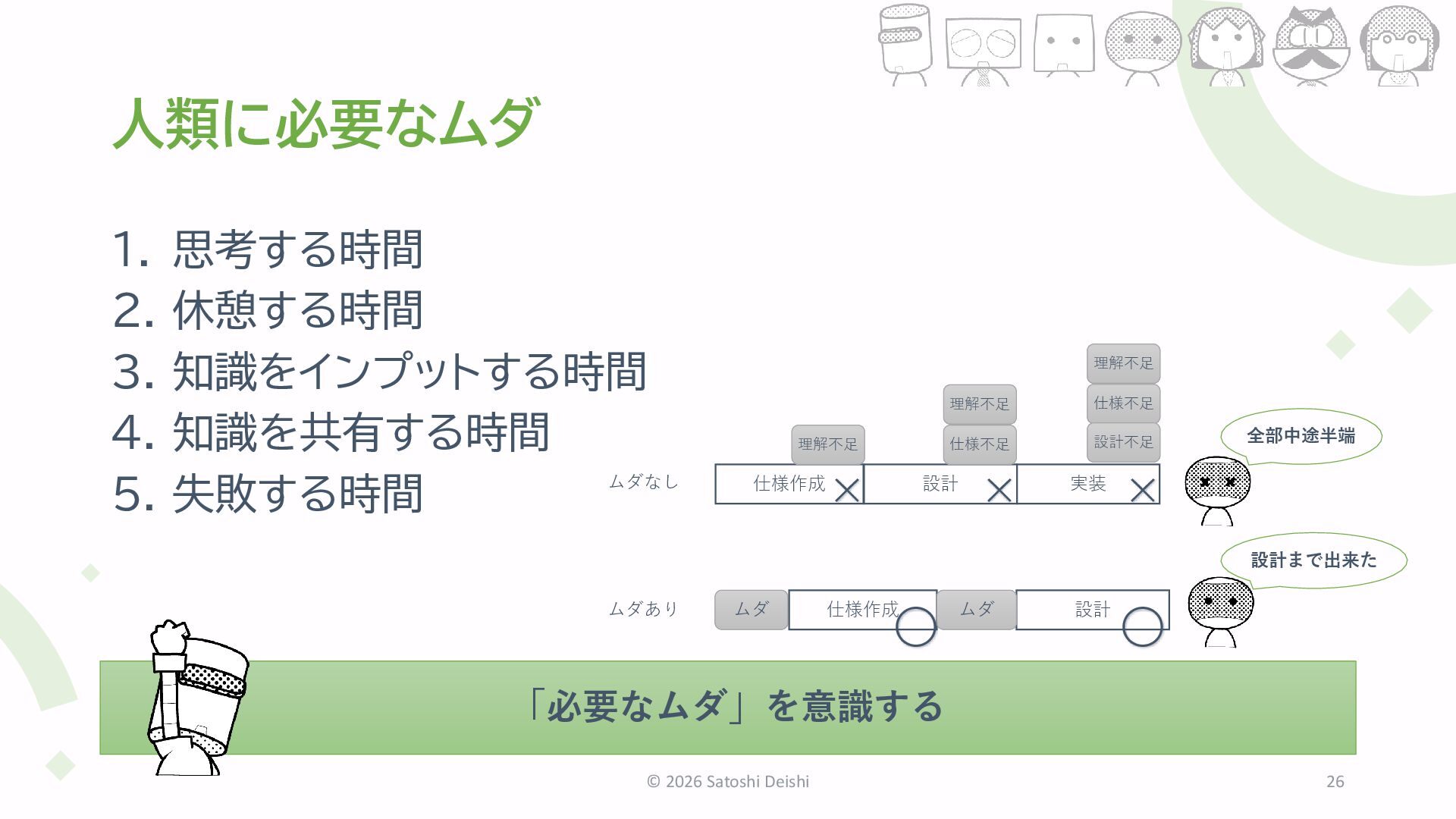 失敗する時間 © 2026 Satoshi Deishi 26 仕様作成 設計 実装 ムダ 仕様不足 × × × 仕様作成 設計 〇 理解不足 理解不足 仕様不足 理解不足 設計不足 ムダ 〇 ムダなし ムダあり 全部中途半端 設計まで出来た 「必要なムダ」を意識する