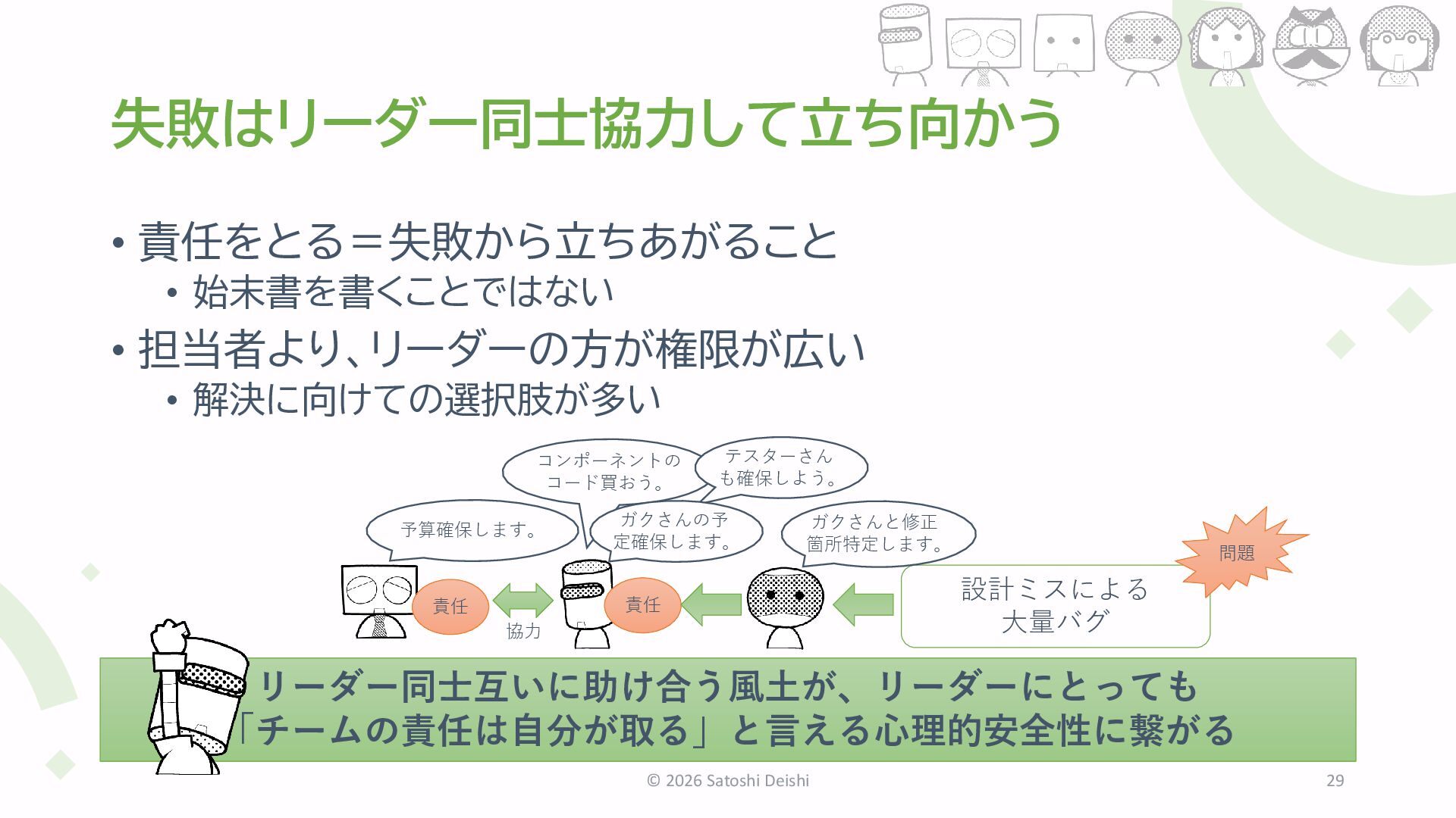 2026 Satoshi Deishi 29 責任 協力 予算確保します。 コンポーネントの コード買おう。 テスターさん も確保しよう。 責任 ガクさんの予 定確保します。 設計ミスによる 大量バグ ガクさんと修正 箇所特定します。 問題 リーダー同士互いに助け合う風土が、リーダーにとっても 「チームの責任は自分が取る」と言える心理的安全性に繋がる