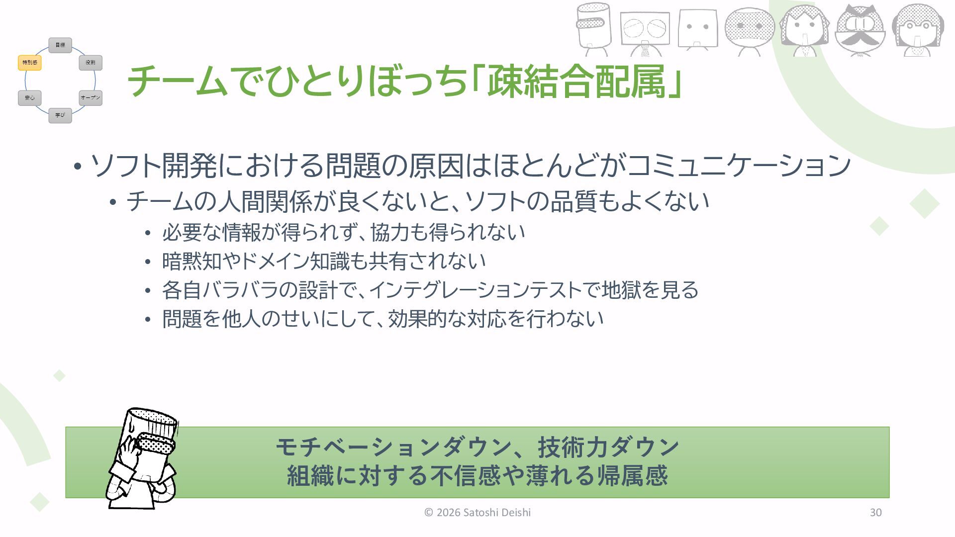 各自バラバラの設計で、インテグレーションテストで地獄を見る • 問題を他人のせいにして、効果的な対応を行わない © 2026 Satoshi Deishi 30 モチベーションダウン、技術力ダウン 組織に対する不信感や薄れる帰属感 目標 役割 オープン 学び 安心 特別感