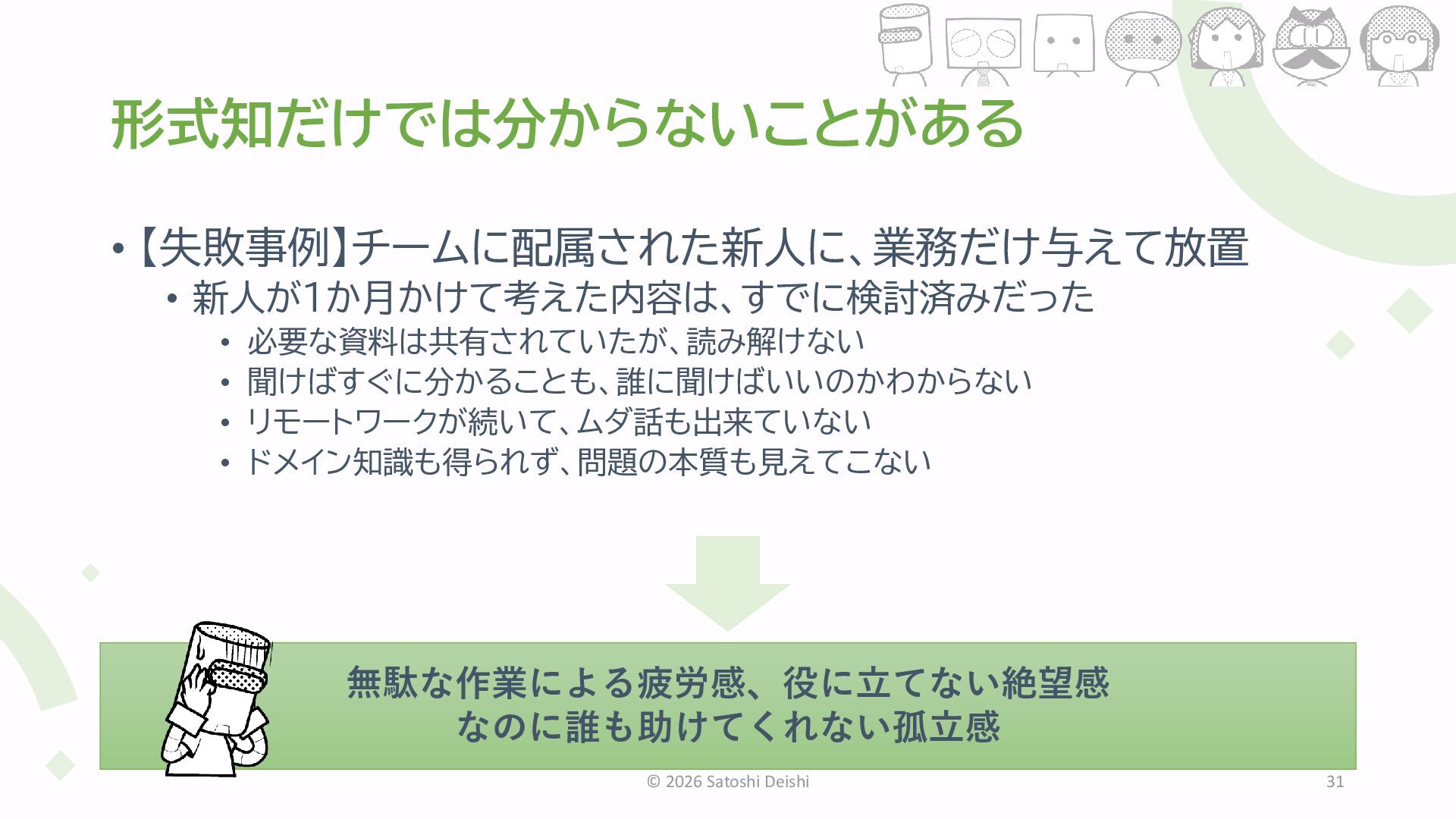 リモートワークが続いて、ムダ話も出来ていない • ドメイン知識も得られず、問題の本質も見えてこない © 2026 Satoshi Deishi 31 無駄な作業による疲労感、役に立てない絶望感 なのに誰も助けてくれない孤立感