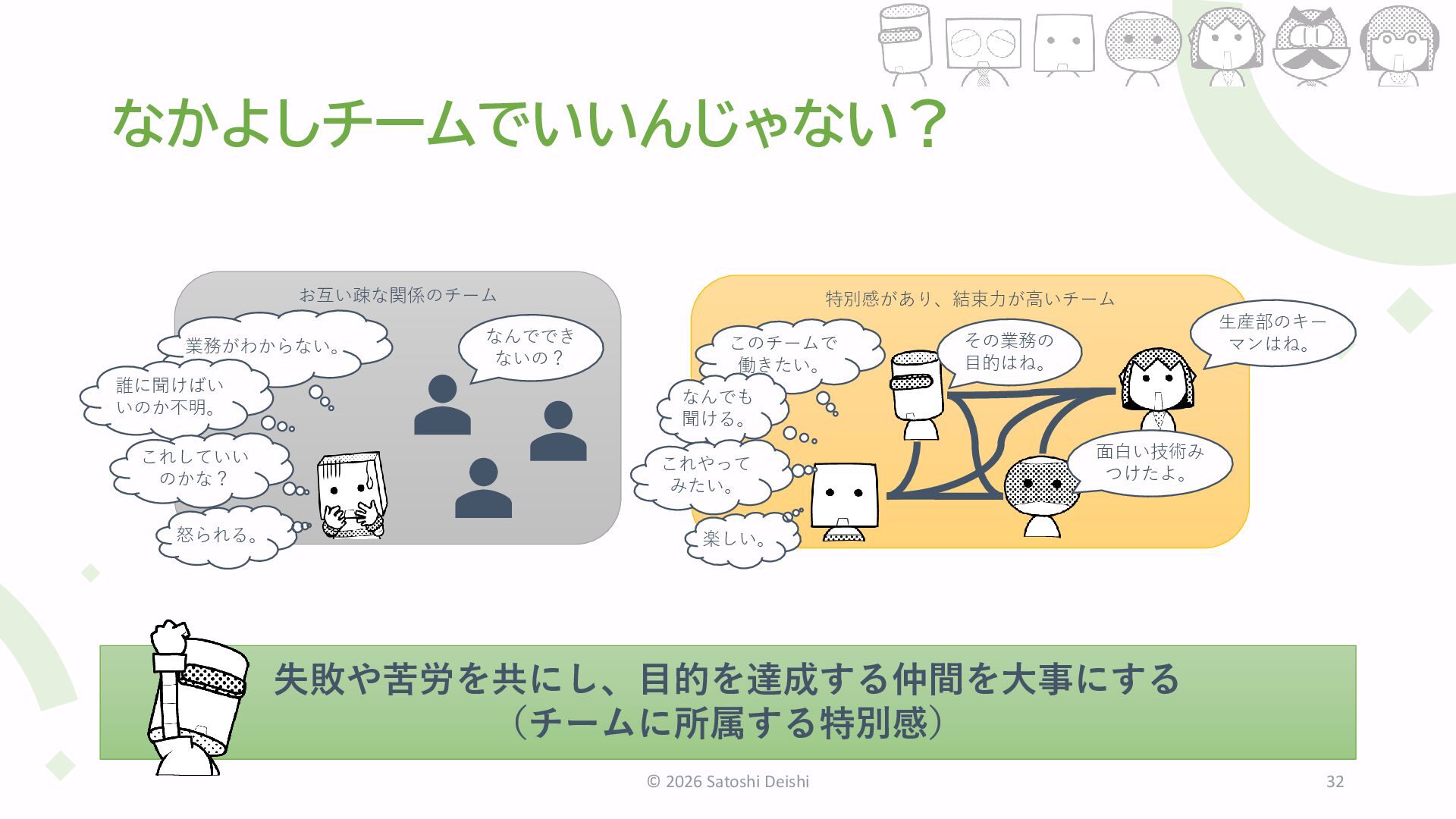 22. なかよしチームでいいんじゃない? © 2026 Satoshi Deishi 32 失敗や苦労を共にし、目的を達成する仲間を大事にする (チームに所属する特別感) お互い疎な関係のチーム なんででき