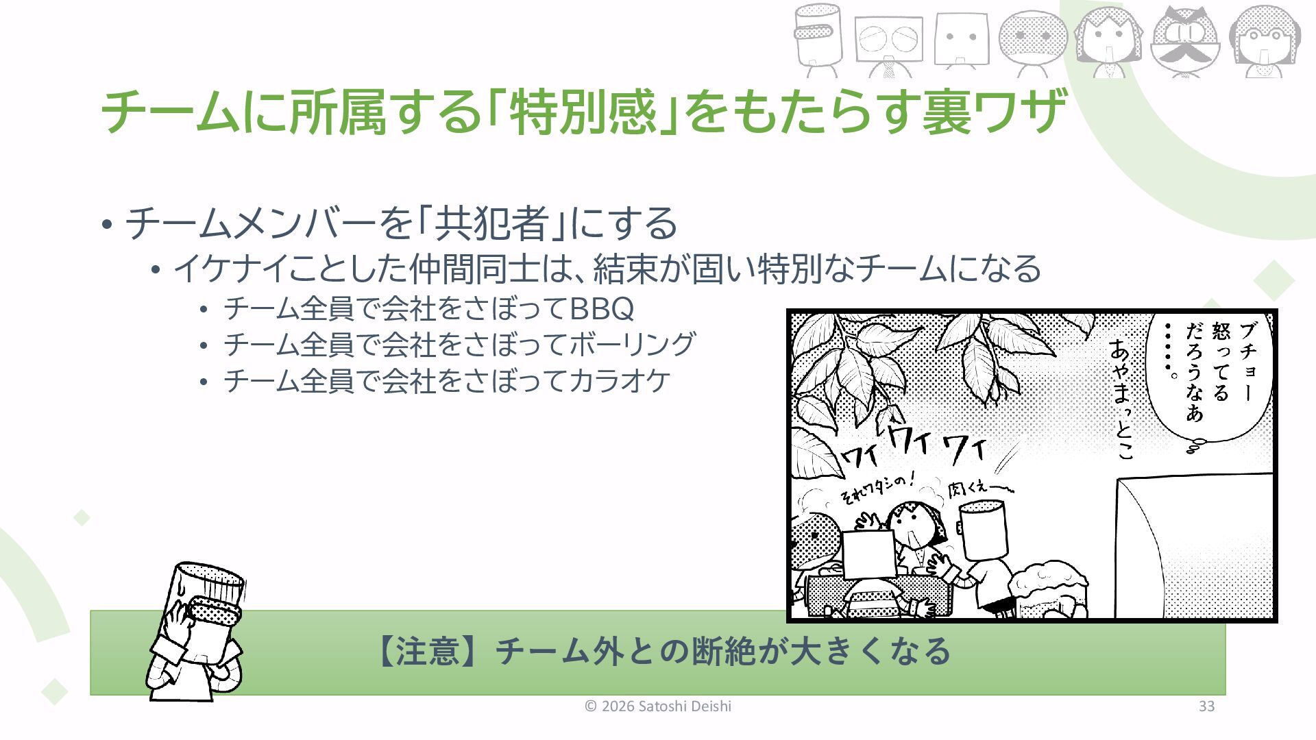 会議におやつを持ち込むだけで会話量2倍(当社比) • 食べることは生きること →生きるためのエネルギーをくれる場所 © 2026 Satoshi Deishi 22 このチームでリスクをとっても殺されない=心理的安全性 ゆるゆるチーム リーダー