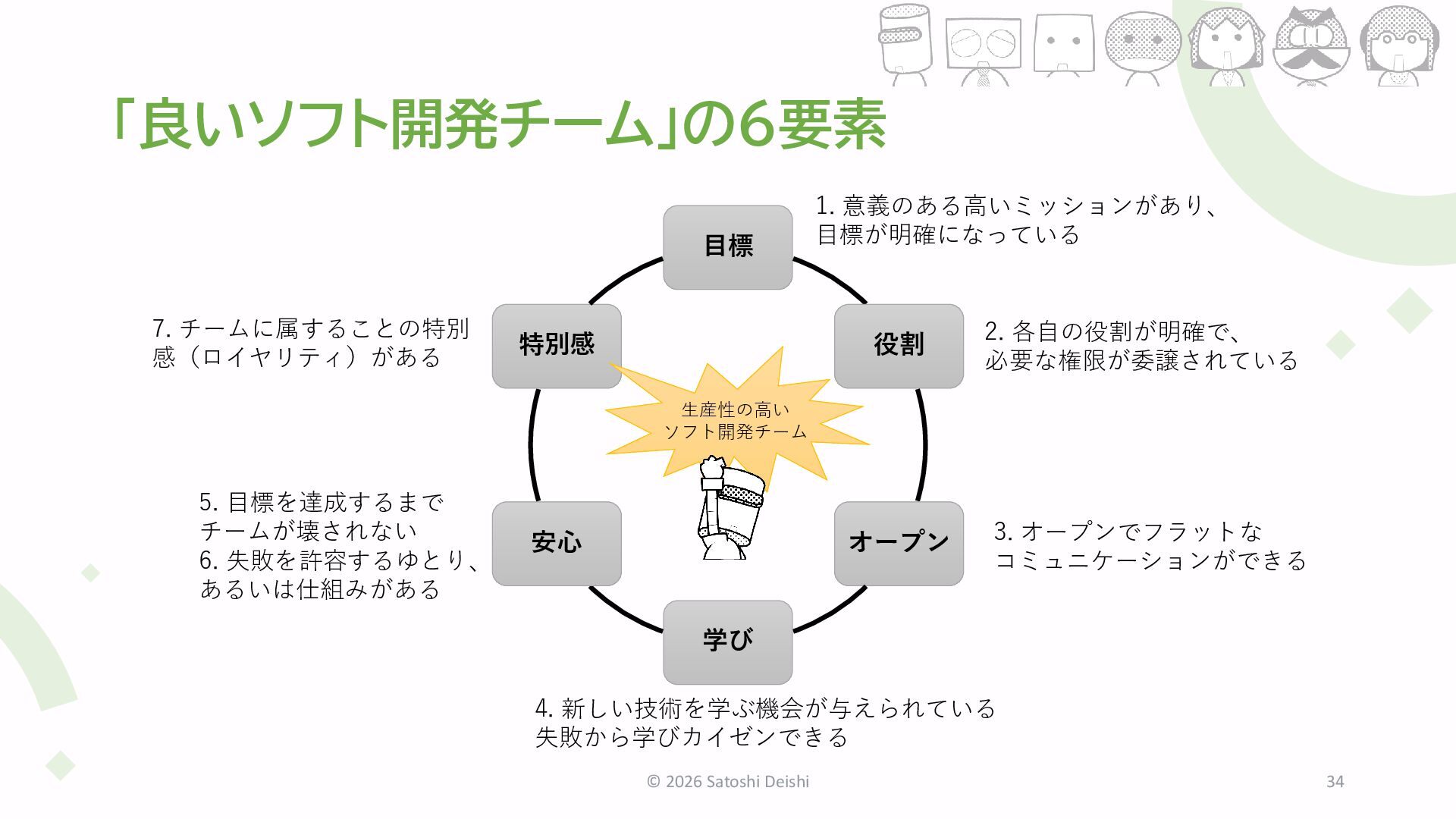 5. 「良いソフト開発チーム」の6要素 © 2026 Satoshi Deishi 10 目標 役割 オープン 学び
