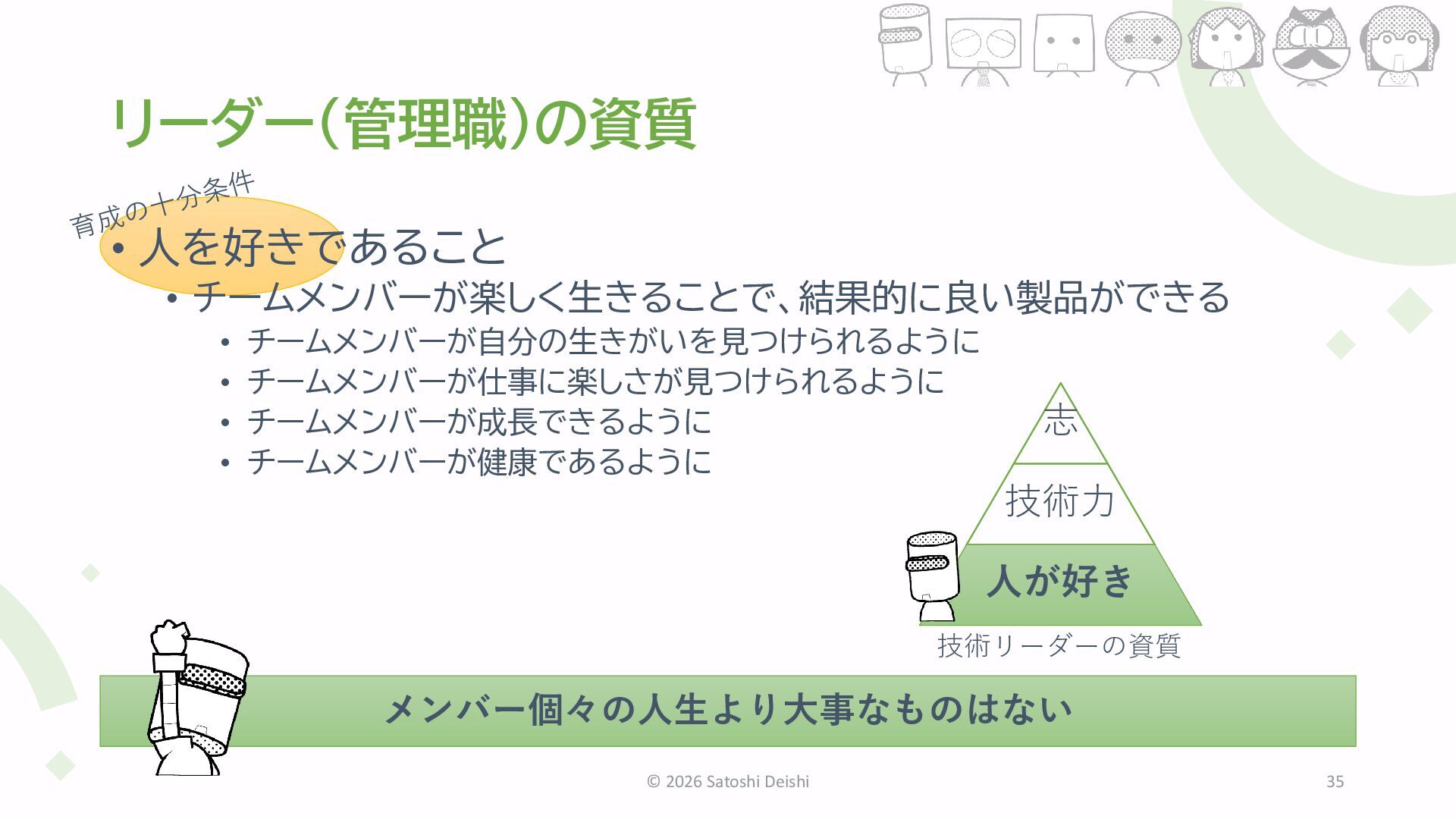 チームメンバーが成長できるように • チームメンバーが健康であるように © 2026 Satoshi Deishi 35 メンバー個々の人生より大事なものはない 志 技術力 人が好き 技術リーダーの資質