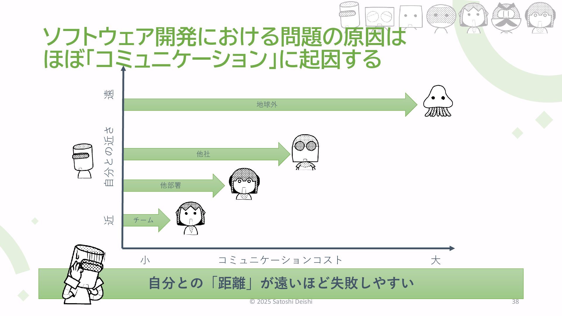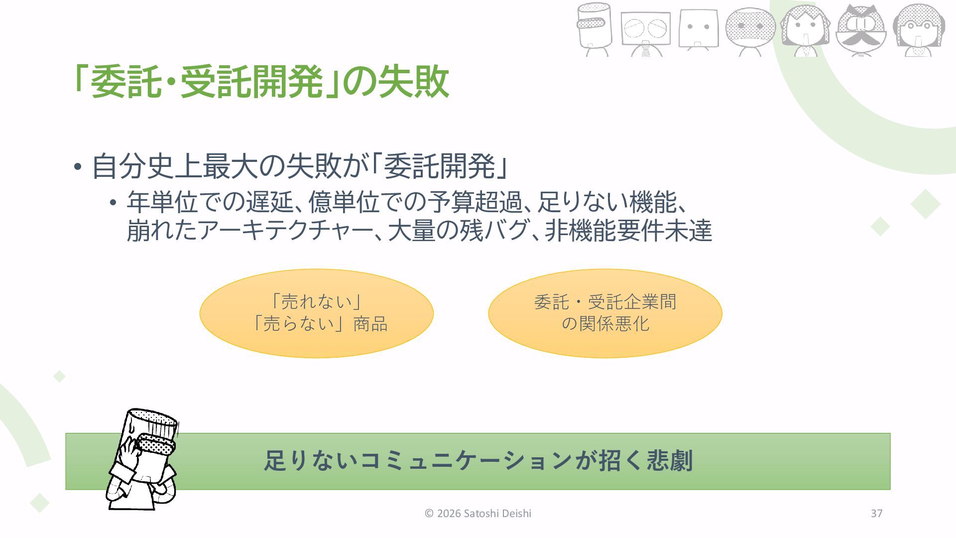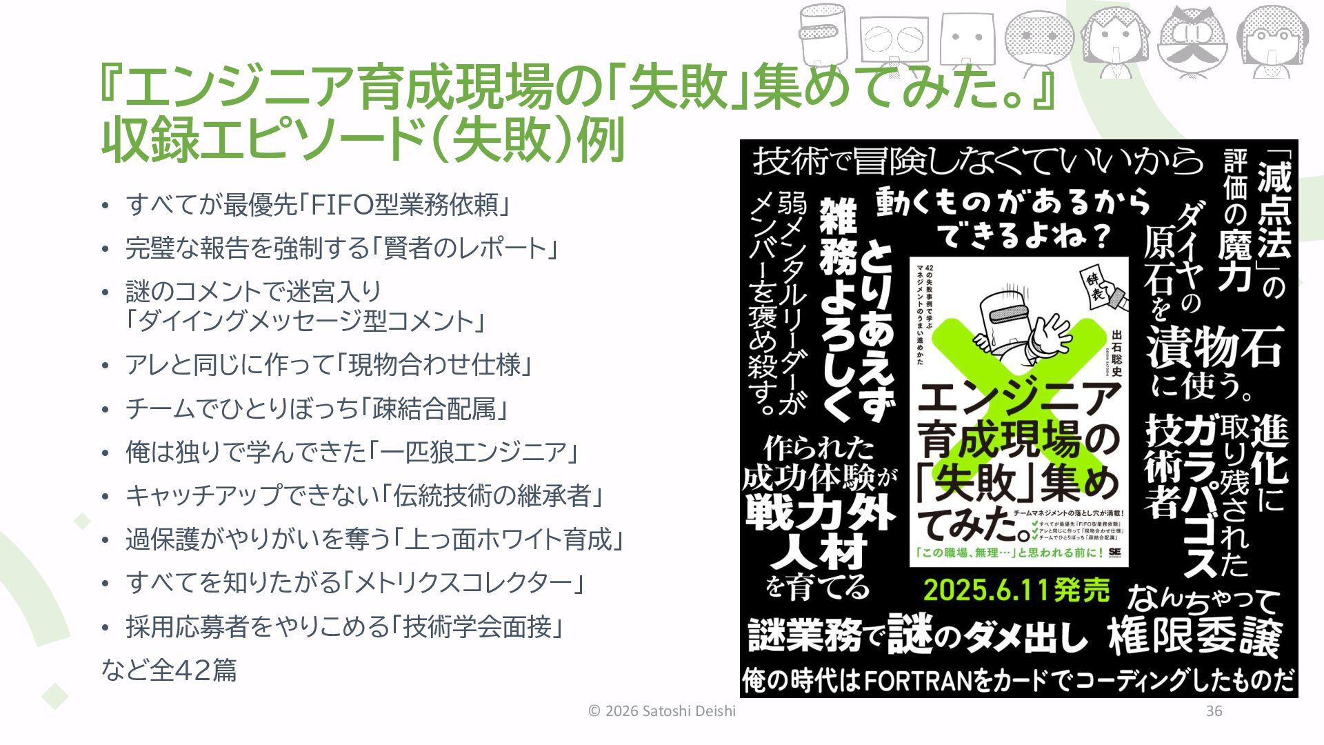 アレと同じに作って「現物合わせ仕様」 • チームでひとりぼっち「疎結合配属」 • 俺は独りで学んできた「一匹狼エンジニア」 • キャッチアップできない「伝統技術の継承者」 • 過保護がやりがいを奪う「上っ面ホワイト育成」 • すべてを知りたがる「メトリクスコレクター」 • 採用応募者をやりこめる「技術学会面接」 など全42篇 © 2026 Satoshi Deishi 36