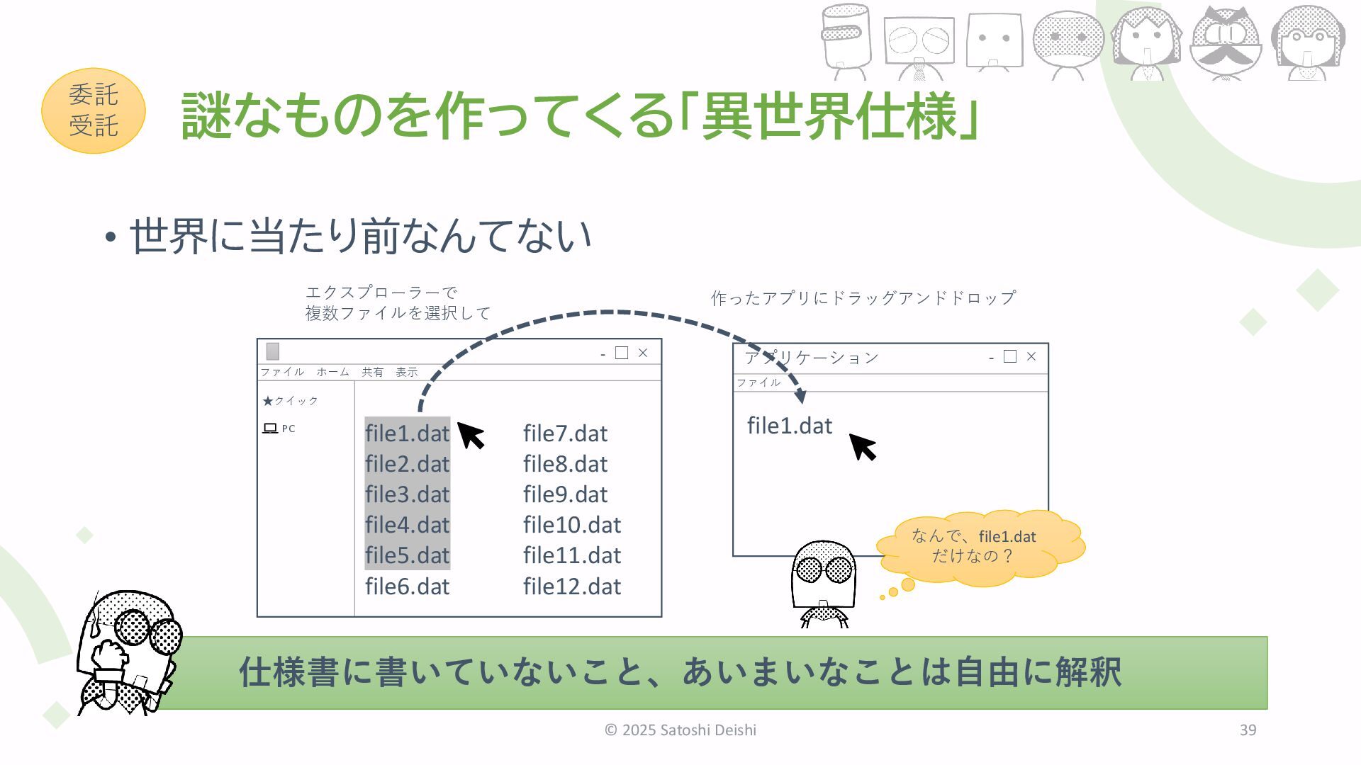 26. 謎なものを作ってくる「異世界仕様」 • 世界に当たり前なんてない © 2025 Satoshi Deishi 39 仕様書に書いていないこと、あいまいなことは自由に解釈 委託