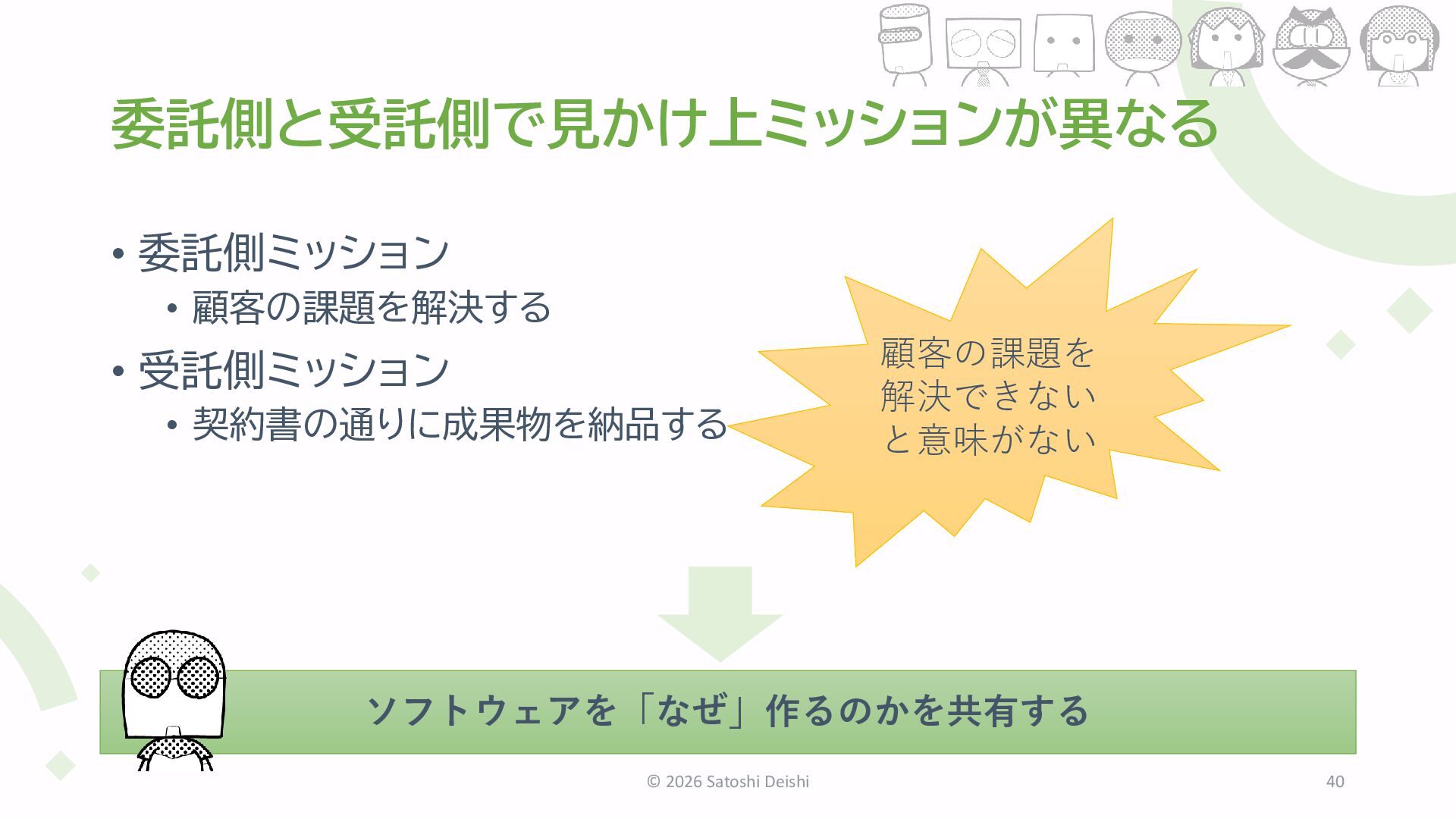 2026 Satoshi Deishi 40 ソフトウェアを「なぜ」作るのかを共有する 顧客の課題を 解決できない と意味がない