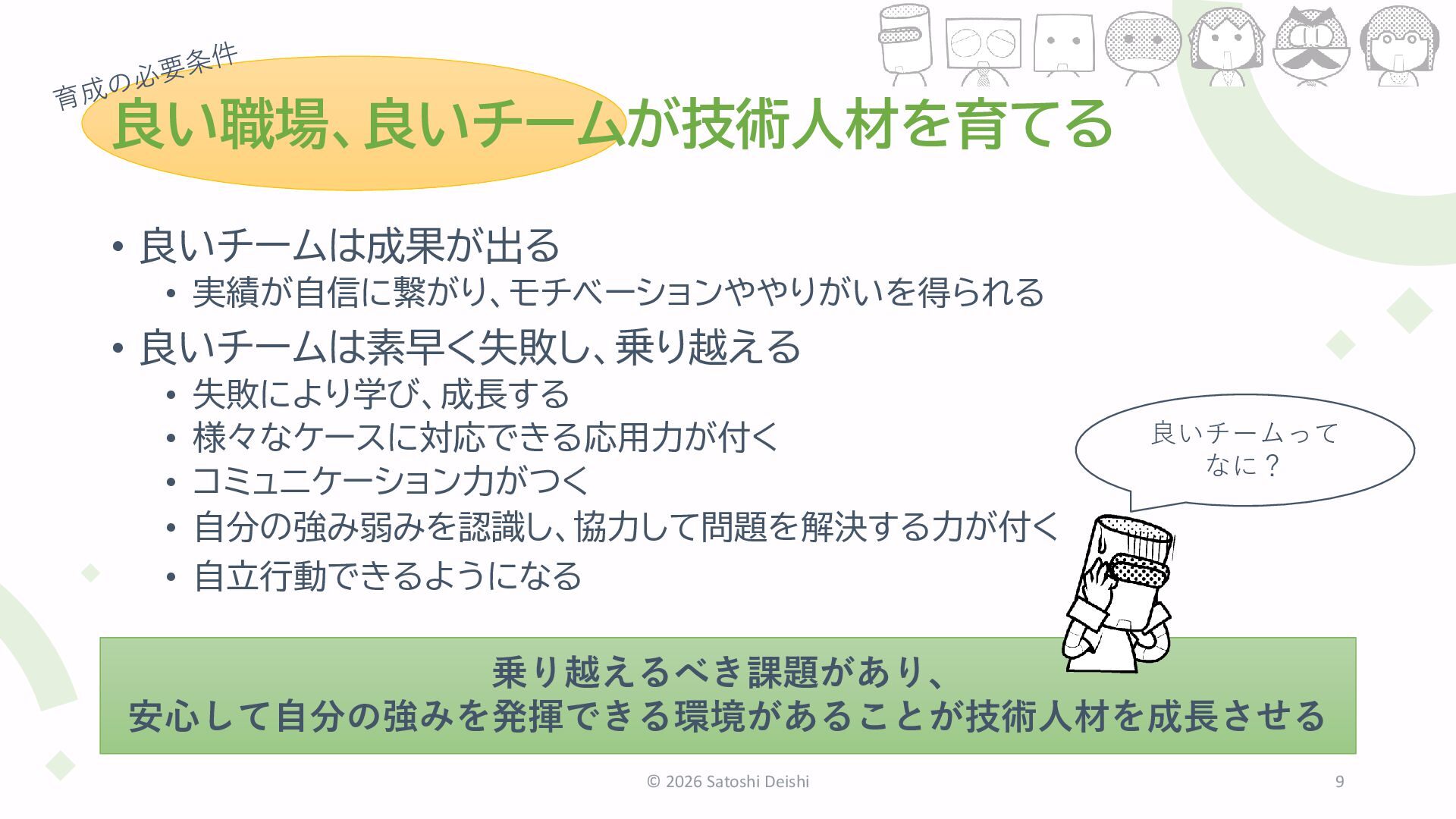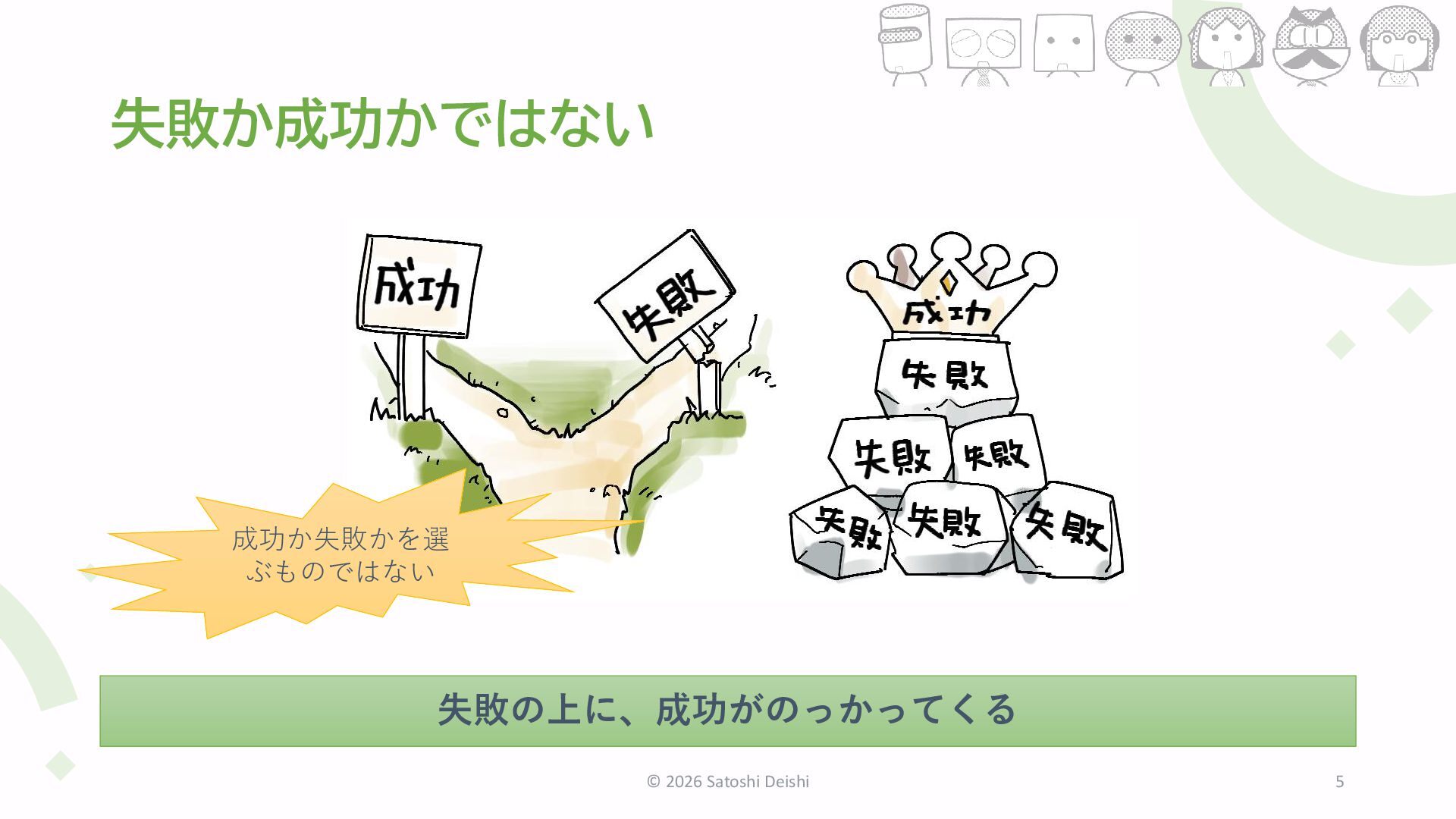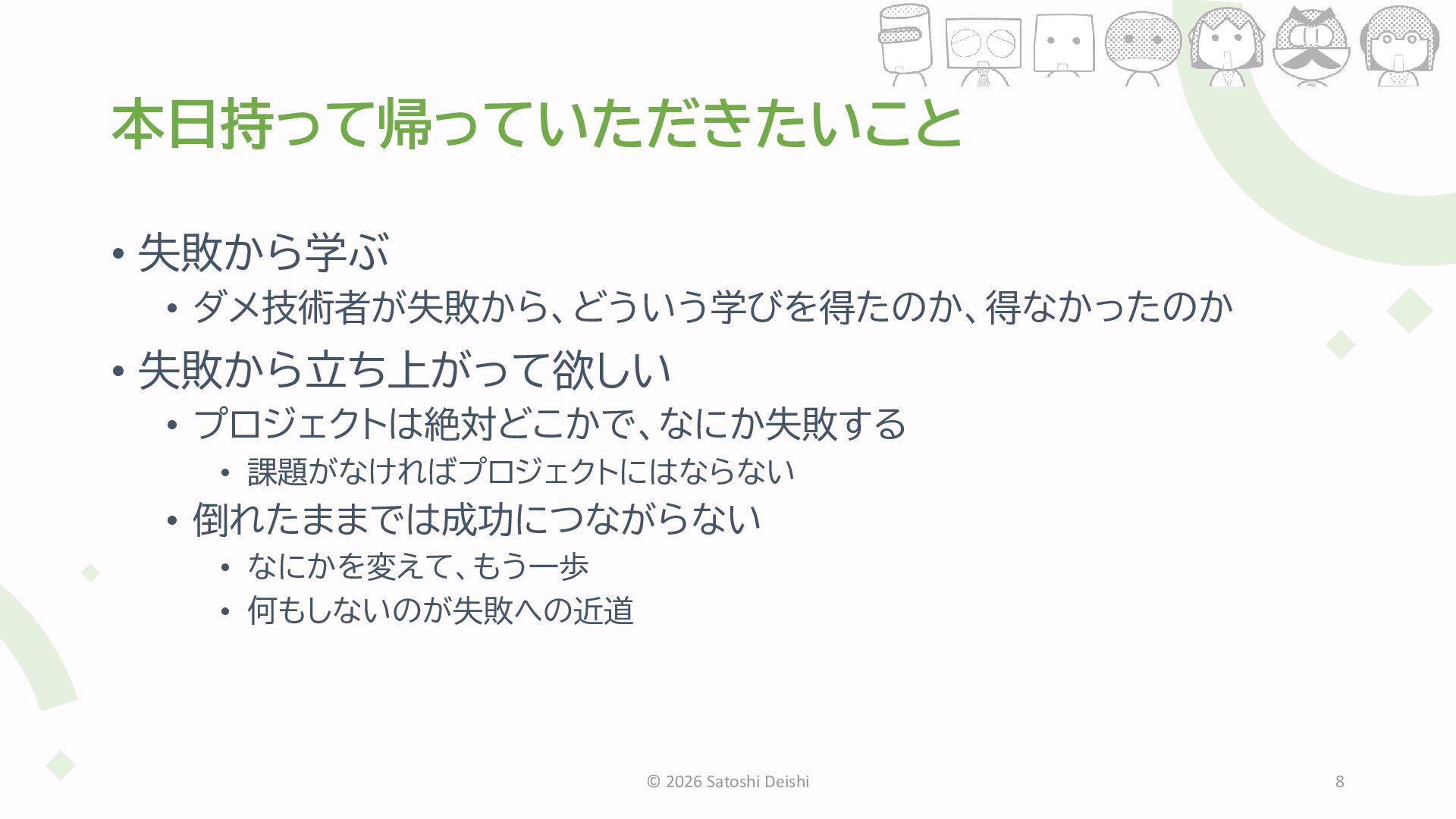 課題がなければプロジェクトにはならない • 倒れたままでは成功につながらない • なにかを変えて、もう一歩 • 何もしないのが失敗への近道 © 2026 Satoshi Deishi 8
