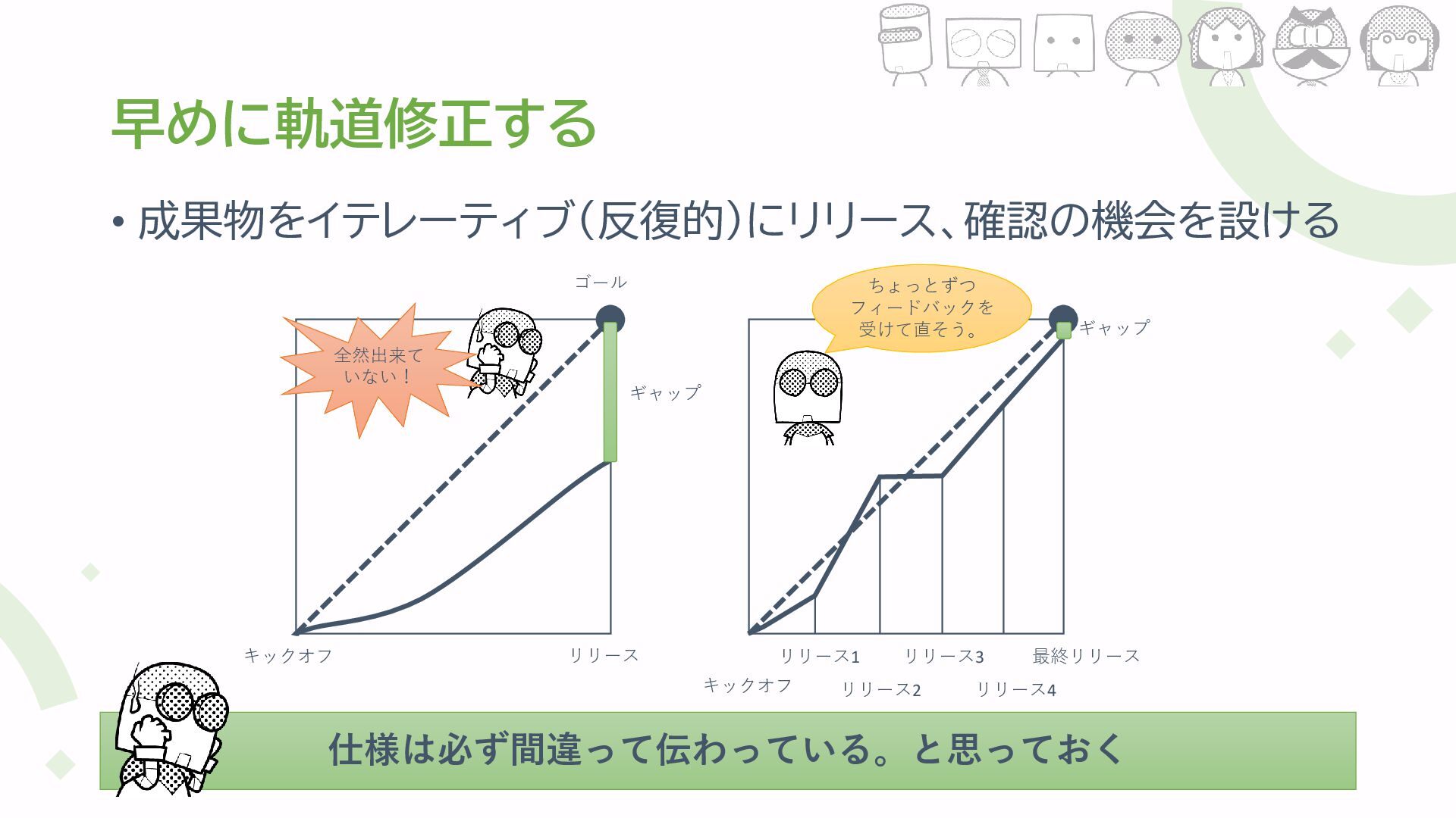ゴール ギャップ 全然出来て いない! 最終リリース リリース1 ギャップ ちょっとずつ フィードバックを 受けて直そう。 リリース2 リリース3 リリース4 キックオフ 仕様は必ず間違って伝わっている。と思っておく