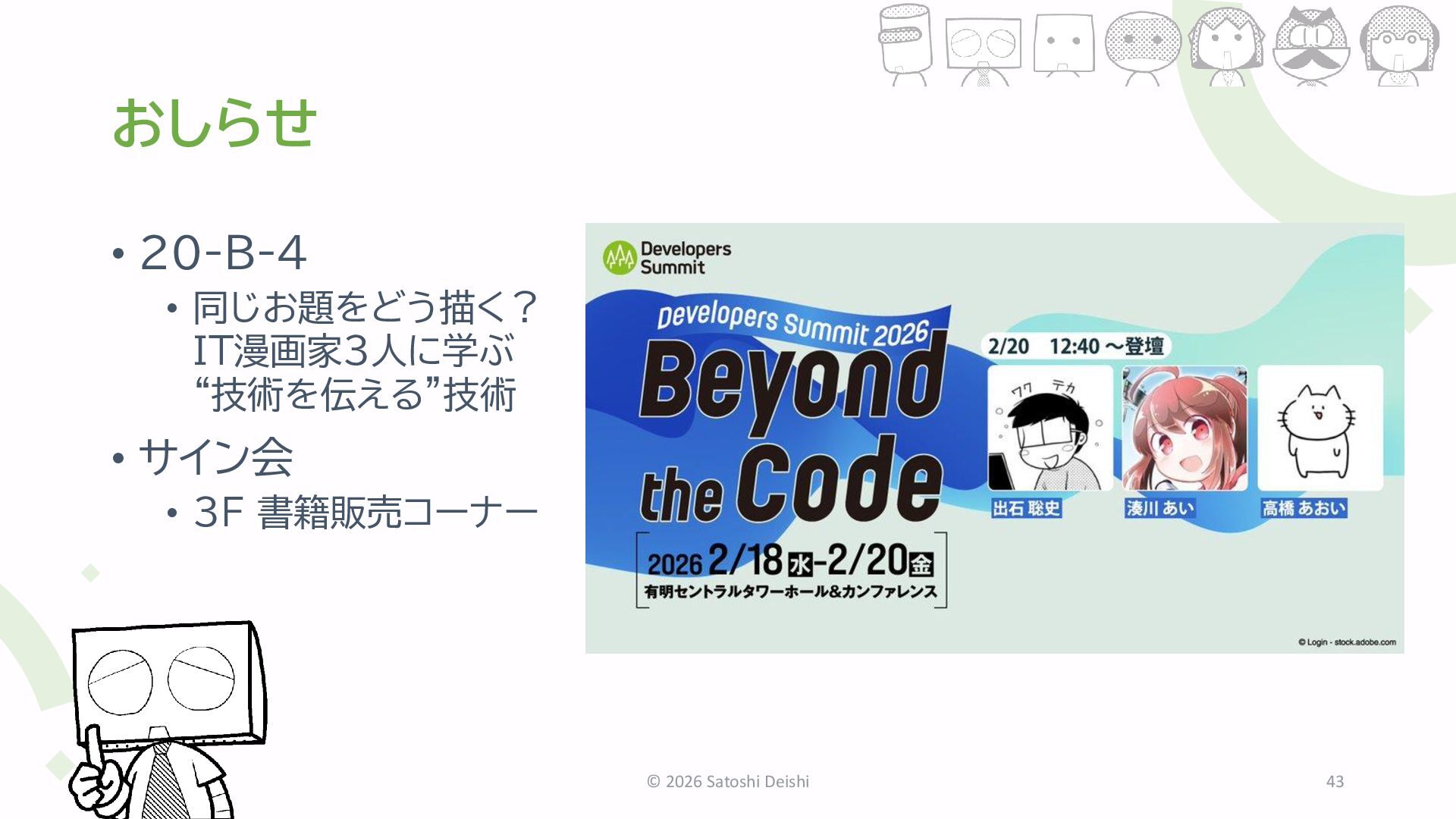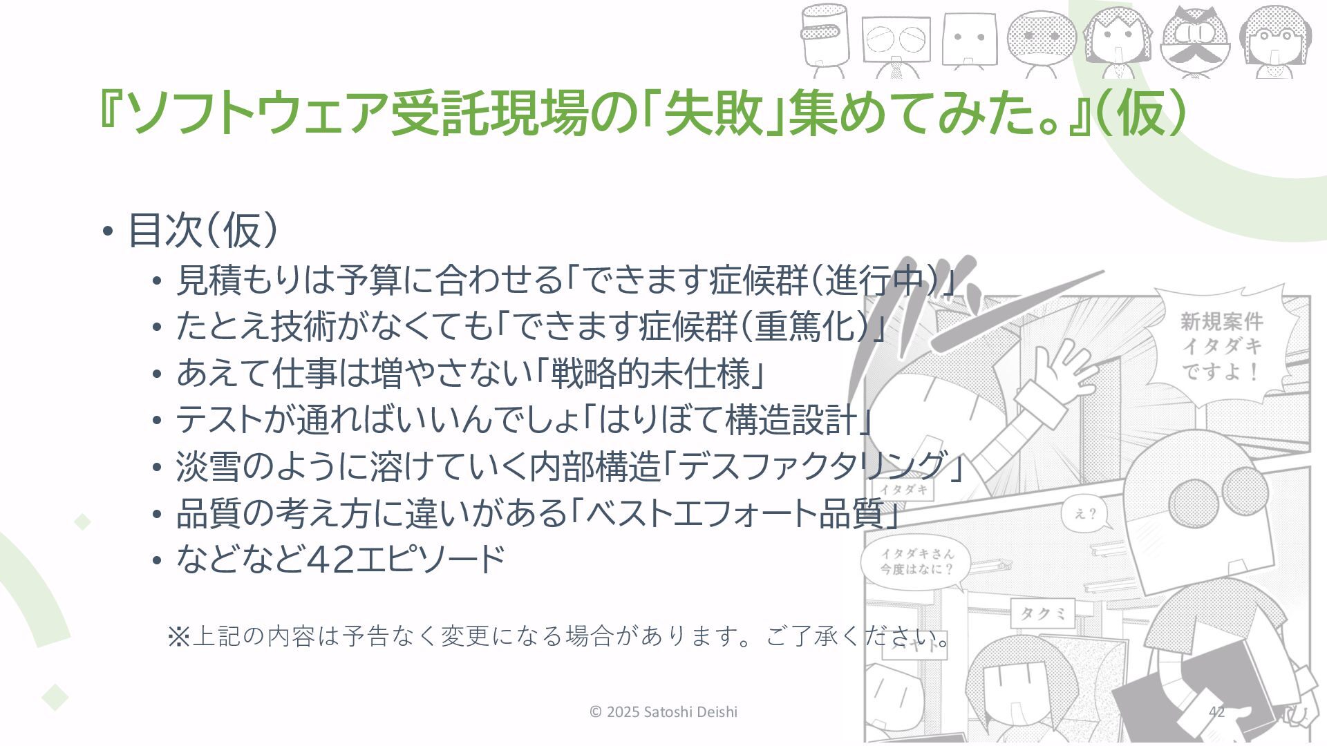 テストが通ればいいんでしょ「はりぼて構造設計」 • 淡雪のように溶けていく内部構造「デスファクタリング」 • 品質の考え方に違いがある「ベストエフォート品質」 • などなど42エピソード © 2025 Satoshi Deishi 42 ※上記の内容は予告なく変更になる場合があります。ご了承ください。
