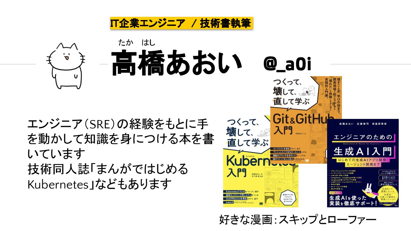 エンジニア(SRE)の経験をもとに手 を動かして知識を身につける本を書 いています 技術同人誌「まんがではじめる Kubernetes」などもあります 好きな漫画:スキップとローファー