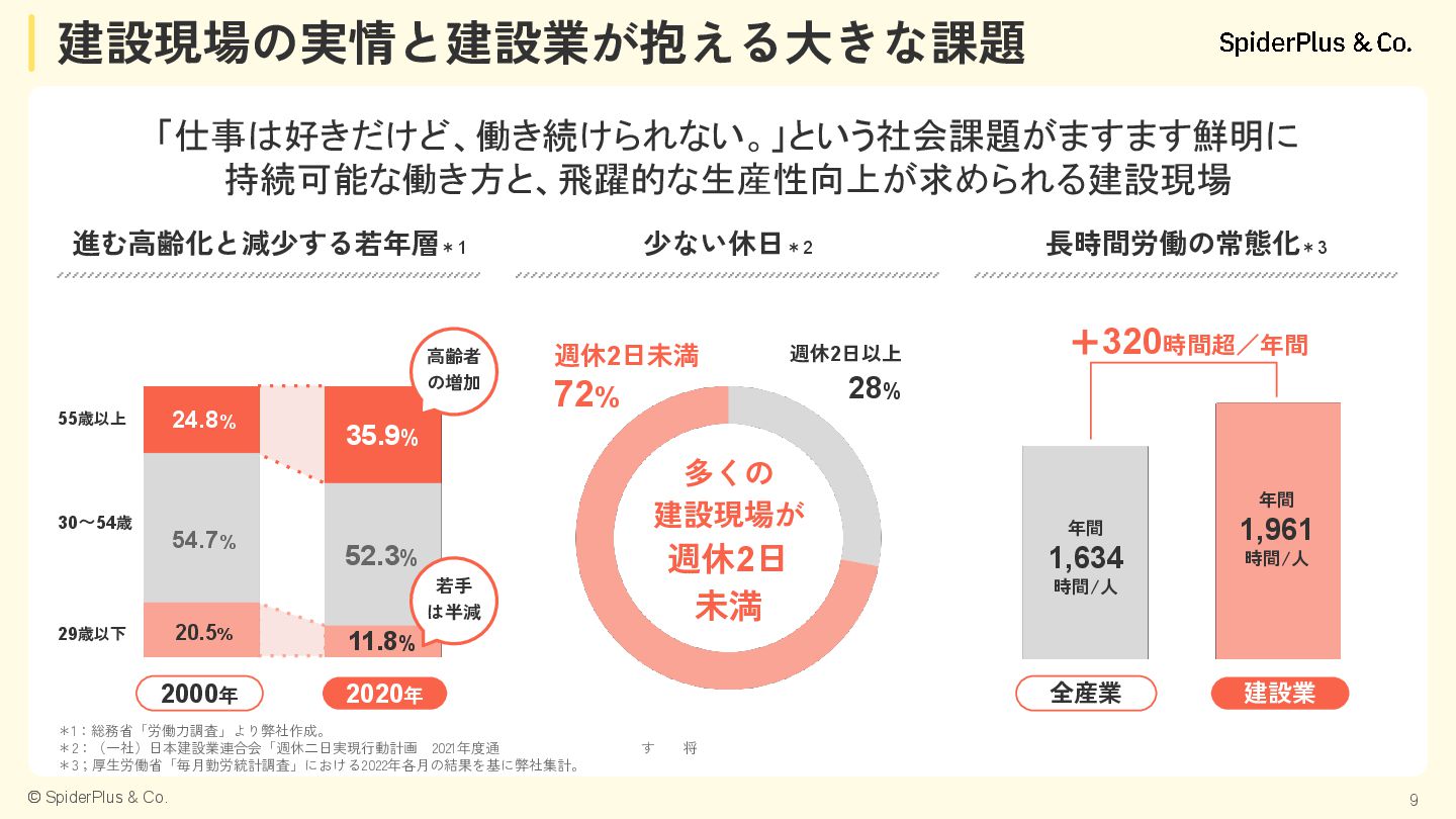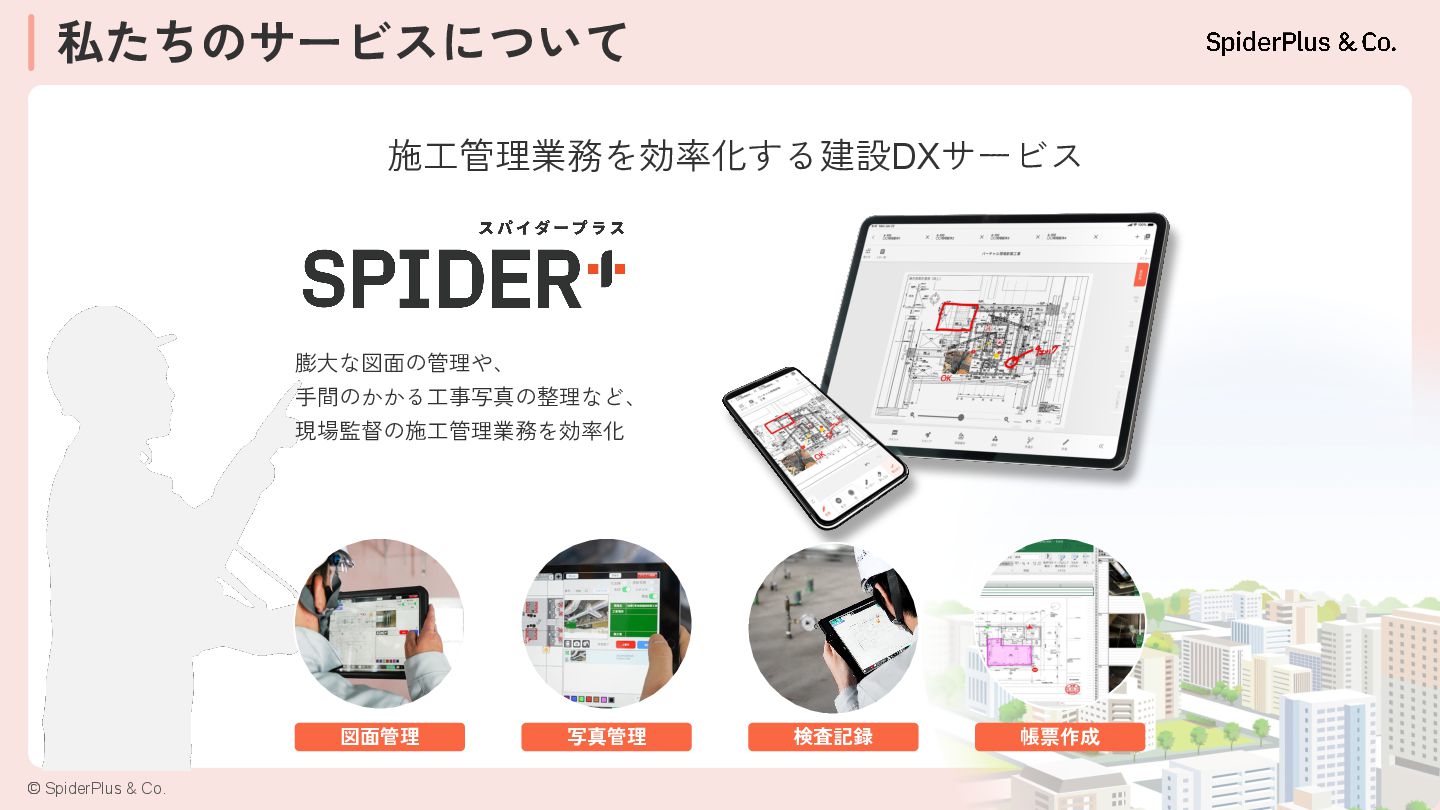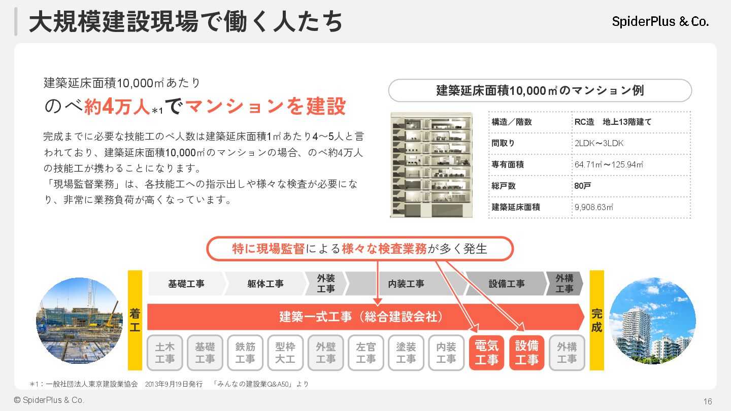 内装工事 設備工事 外構 工事 土木 工事 基礎 工事 鉄筋 工事 型枠 大工 外壁 工事 左官 工事 塗装 工事 内装 工事 電気 工事 設備 工事 外構 工事 建築一式工事(総合建設会社) 着 工 完 成 完成までに必要な技能工のべ人数は建築延床面積1㎡あたり4〜5人と言 われており、建築延床面積10,000㎡のマンションの場合、のべ約4万人 の技能工が携わることになります。 「現場監督業務」は、各技能工への指示出しや様々な検査が必要にな り、非常に業務負荷が高くなっています。 構造/階数 RC造 地上13階建て 間取り 2LDK~3LDK 専有面積 64.71㎡~125.94㎡ 総戸数 80戸 建築延床面積 9,908.63㎡ 建築延床面積10,000㎡のマンション例 建築延床面積10,000㎡あたり のべ約4万人*1 でマンションを建設 特に現場監督による様々な検査業務が多く発生 *1:一般社団法人東京建設業協会 2013年9月19日発行 「みんなの建設業Q&A50」より