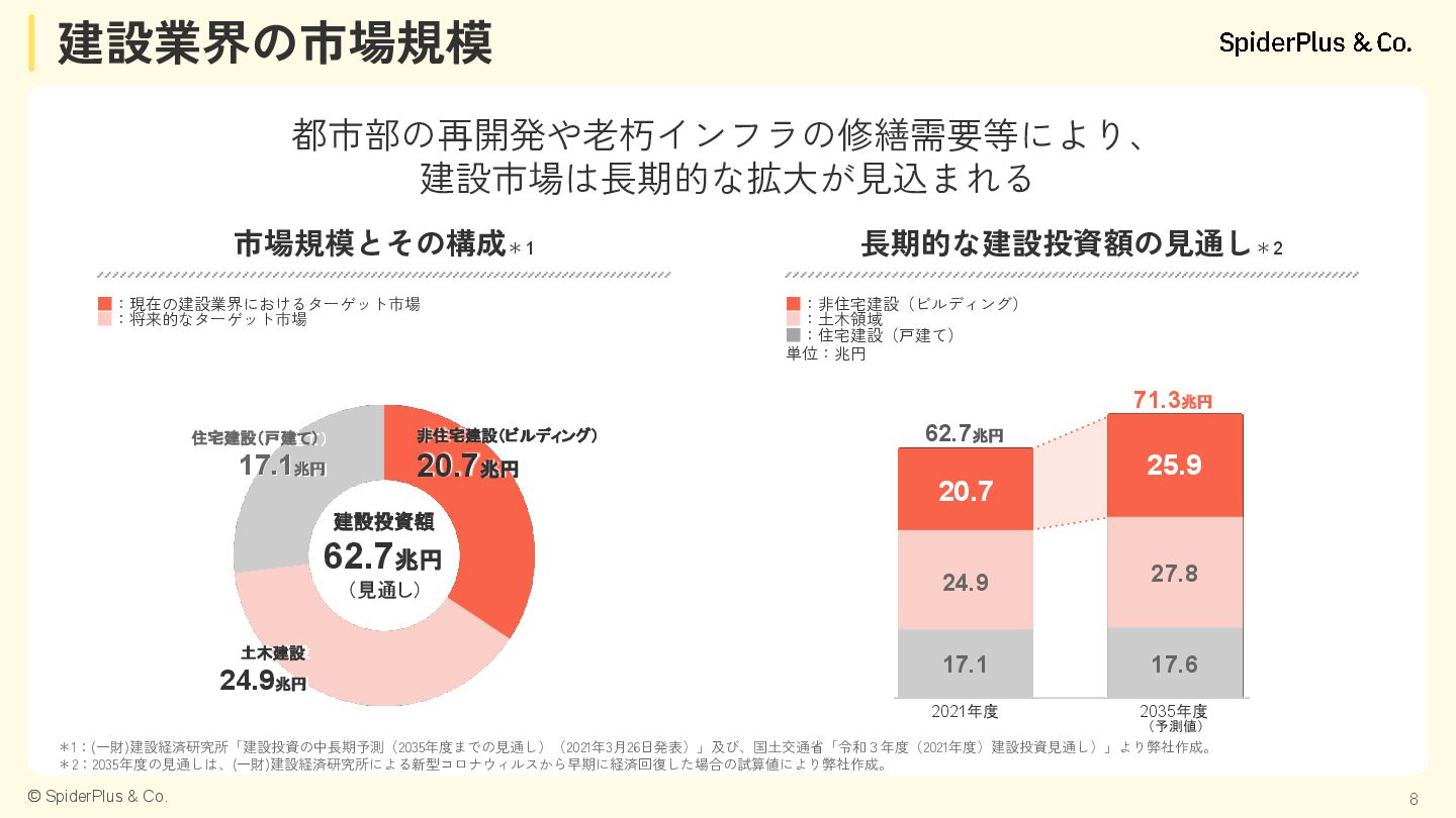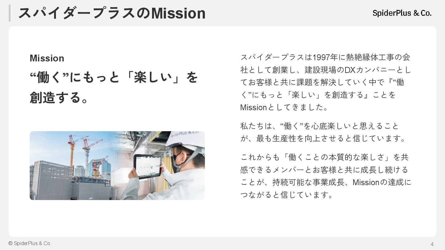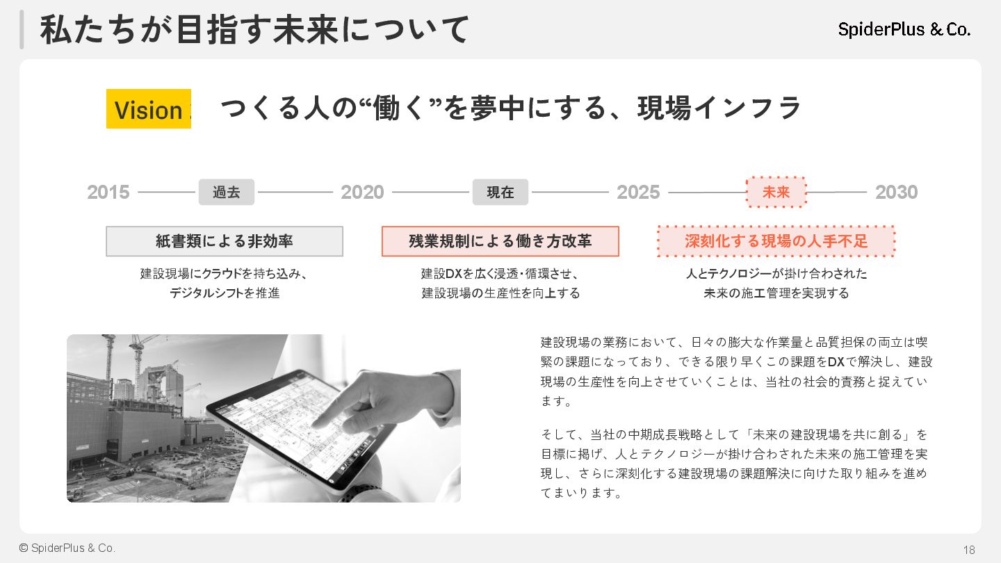 内装工事 設備工事 外構 工事 土木 工事 基礎 工事 鉄筋 工事 型枠 大工 外壁 工事 左官 工事 塗装 工事 内装 工事 電気 工事 設備 工事 外構 工事 建築一式工事(総合建設会社) 着 工 完 成 完成までに必要な技能工のべ人数は建築延床面積1㎡あたり4〜5人と言 われており、建築延床面積10,000㎡のマンションの場合、のべ約4万人 の技能工が携わることになります。 「現場監督業務」は、各技能工への指示出しや様々な検査が必要にな り、非常に業務負荷が高くなっています。 構造/階数 RC造 地上13階建て 間取り 2LDK~3LDK 専有面積 64.71㎡~125.94㎡ 総戸数 80戸 建築延床面積 9,908.63㎡ 建築延床面積10,000㎡のマンション例 建築延床面積10,000㎡あたり のべ約4万人*1 でマンションを建設 特に現場監督による様々な検査業務が多く発生 *1:一般社団法人東京建設業協会 2013年9月19日発行 「みんなの建設業Q&A50」より