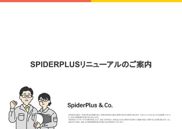 SPIDERPLUSリニューアルのご案内 本資料の内容は、作成日時点の情報であり、事前の告知なく追加・変更がなされる場合があります。それによって生じるいかなる損害について も、当社は賠償責任を免れるものとします。 本資料をスパイダープラス株式会社(以下、当社)の許可なく、他社および公に周知する目的にて複製・転送・公開することを固く禁じます。もし 違反された場合、商法上の損害賠償請求の対象になる可能性がございます。