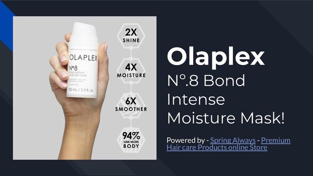 OLAPLEX Nº.8 Bond Intense Moisture Mask, the new treatment that moisturizes, smooths, adds body and shine. Infused in Nº.8 is OLAPLEX’s patented Bond Building technology. This highly concentrated reparative mask provides intense moisture to treat damaged hair. Shop Now https://springalways.co/products/olaplex-no-8-bond-intense-moisture-mask