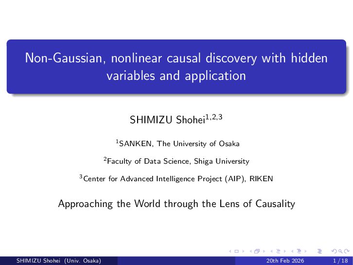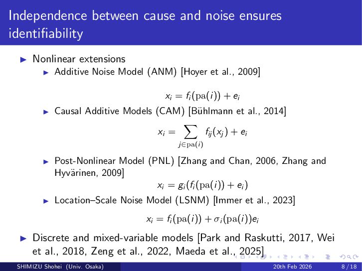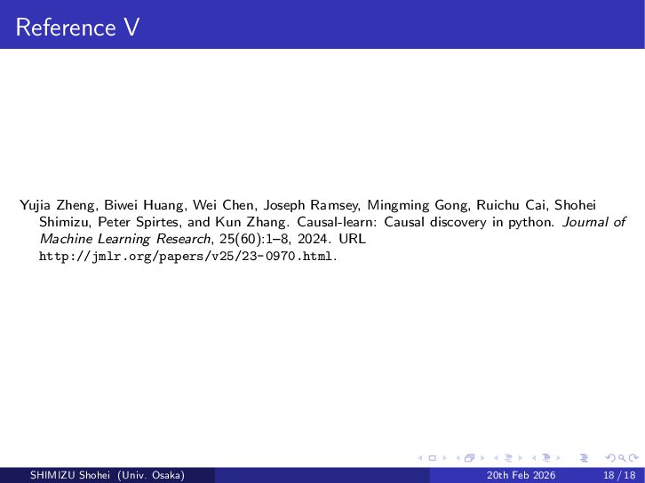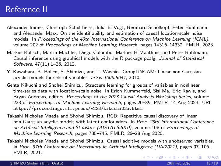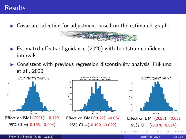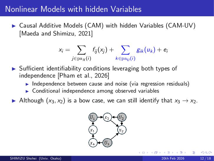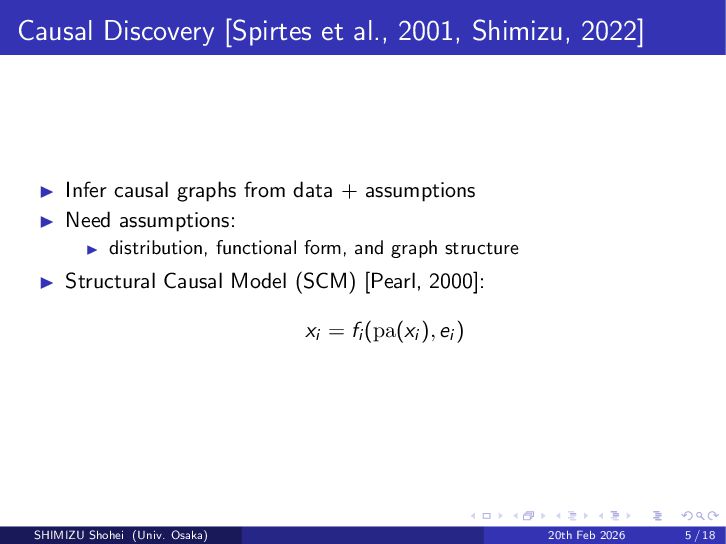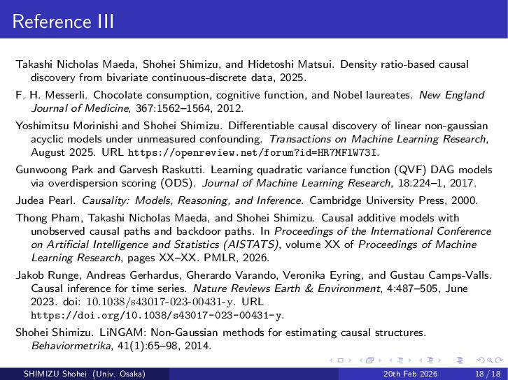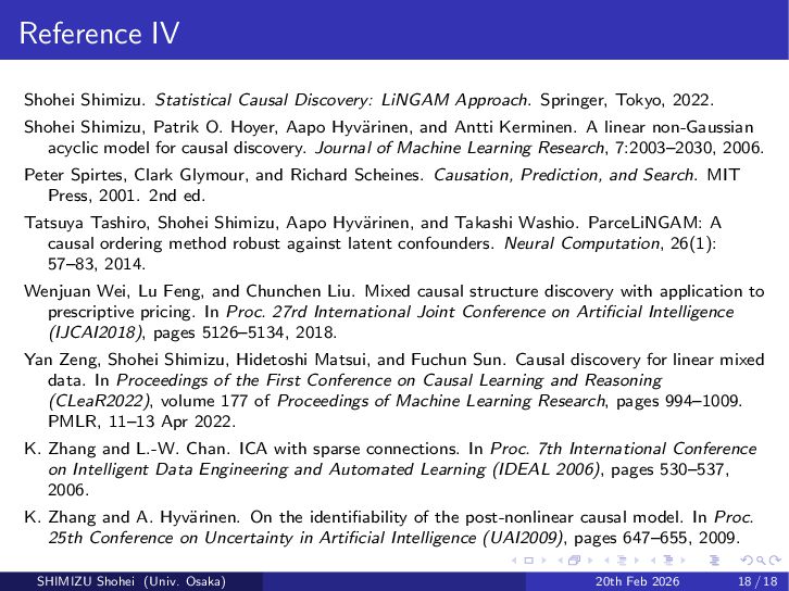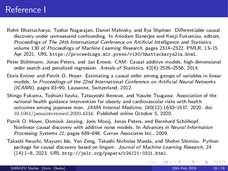 Shpitser. Differentiable causal discovery under unmeasured confounding. In Arindam Banerjee and Kenji Fukumizu, editors, Proceedings of The 24th International Conference on Artificial Intelligence and Statistics, volume 130 of Proceedings of Machine Learning Research, pages 2314–2322. PMLR, 13–15 Apr 2021. URL https://proceedings.mlr.press/v130/bhattacharya21a.html. Peter B¨ uhlmann, Jonas Peters, and Jan Ernest. CAM: Causal additive models, high-dimensional order search and penalized regression. Annals of Statistics, 42(6):2526–2556, 2014. Doris Entner and Patrik O. Hoyer. Estimating a causal order among groups of variables in linear models. In Proceedings of the 22nd International Conference on Artificial Neural Networks (ICANN), pages 83–90, Lausanne, Switzerland, 2012. Shingo Fukuma, Toshiaki Iizuka, Tatsuyoshi Ikenoue, and Yusuke Tsugawa. Association of the national health guidance intervention for obesity and cardiovascular risks with health outcomes among japanese men. JAMA Internal Medicine, 180(12):1630–1637, 2020. doi: 10.1001/jamainternmed.2020.4334. Published online October 5, 2020. Patrik O. Hoyer, Dominik Janzing, Joris Mooij, Jonas Peters, and Bernhard Sch¨ olkopf. Nonlinear causal discovery with additive noise models. In Advances in Neural Information Processing Systems 21, pages 689–696. Curran Associates Inc., 2009. Takashi Ikeuchi, Mayumi Ide, Yan Zeng, Takashi Nicholas Maeda, and Shohei Shimizu. Python package for causal discovery based on lingam. Journal of Machine Learning Research, 24 (14):1–8, 2023. URL http://jmlr.org/papers/v24/21-0321.html. SHIMIZU Shohei (Univ. Osaka) 20th Feb 2026 18 / 18