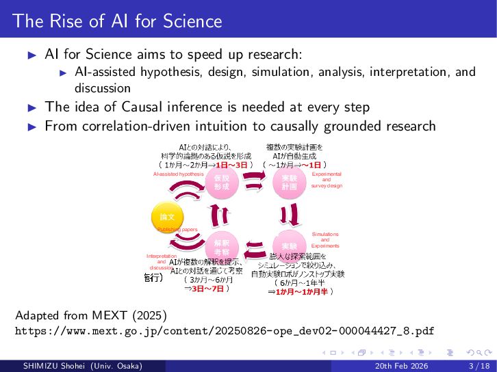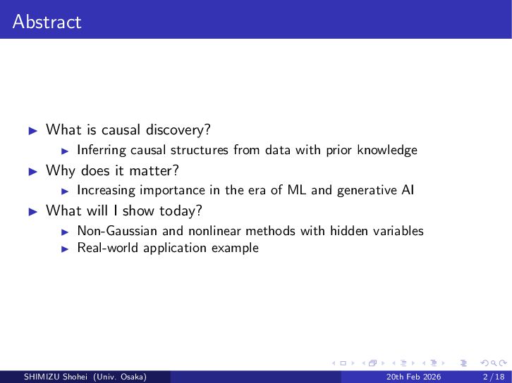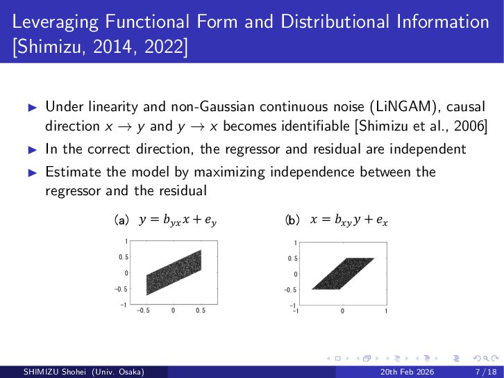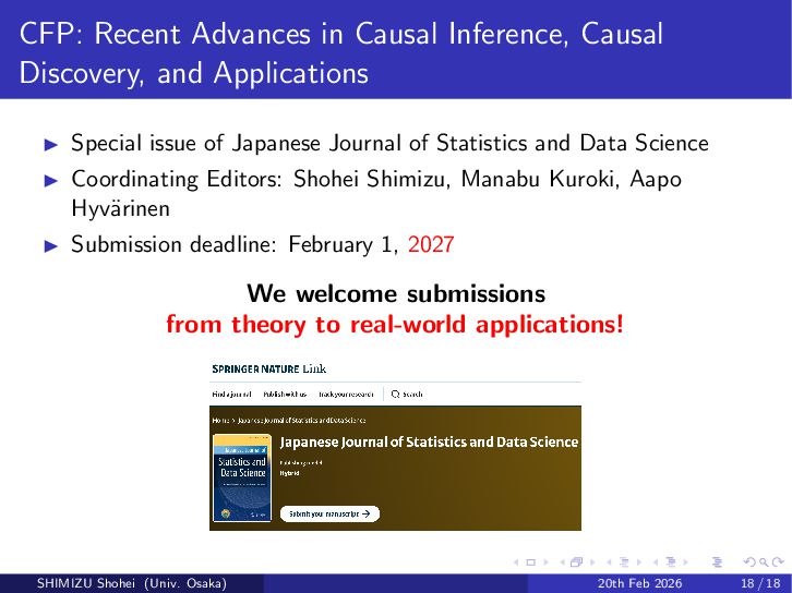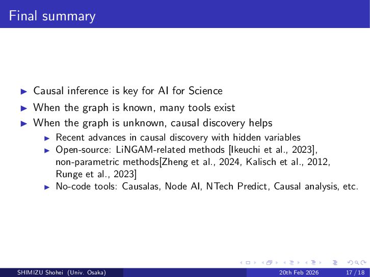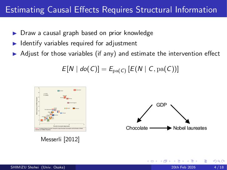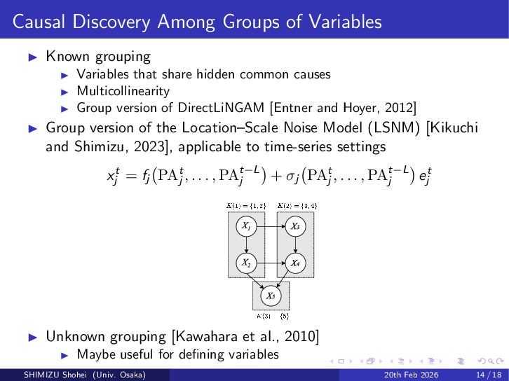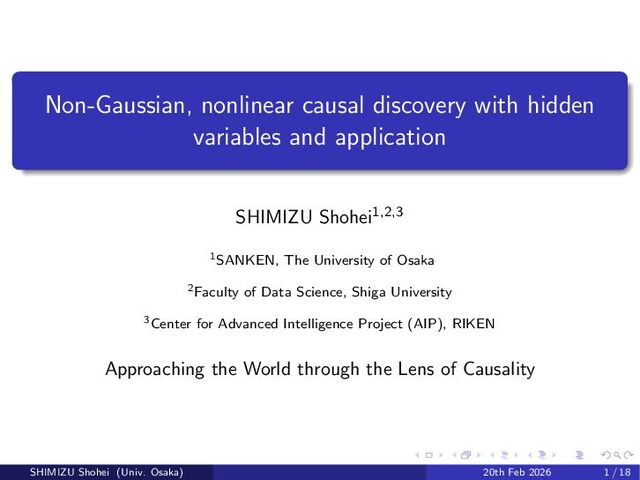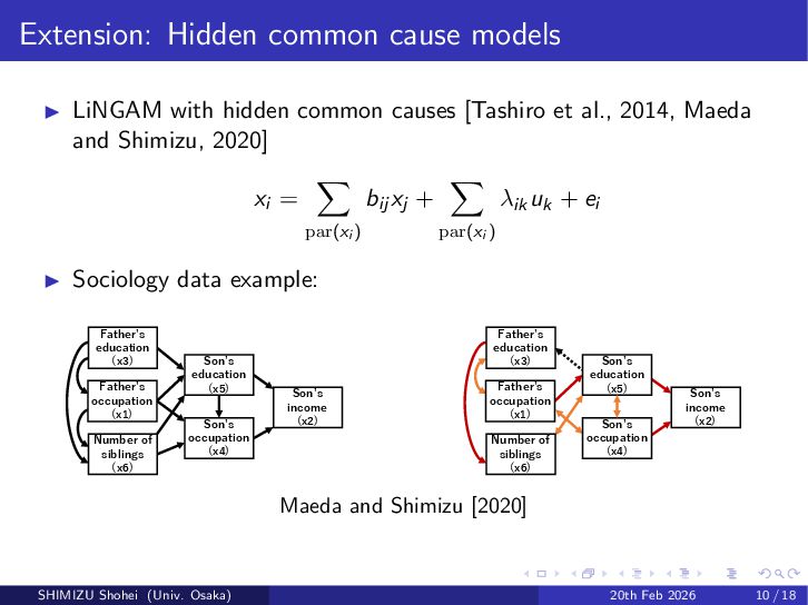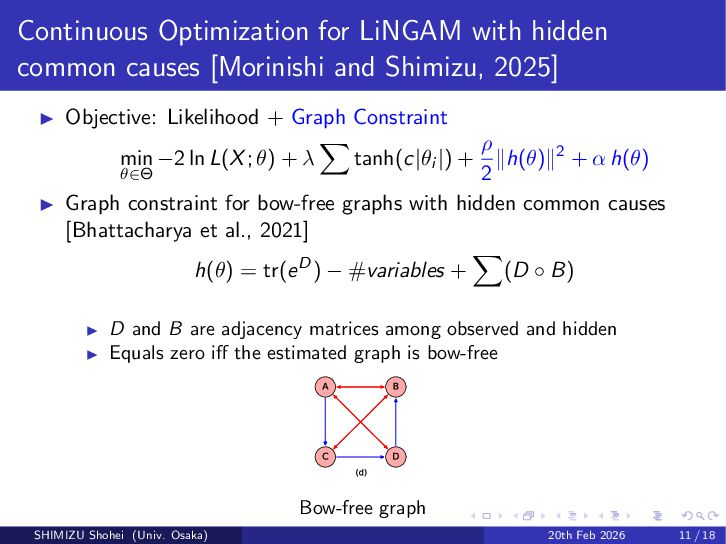 Shpitser. Differentiable causal discovery under unmeasured confounding. In Arindam Banerjee and Kenji Fukumizu, editors, Proceedings of The 24th International Conference on Artificial Intelligence and Statistics, volume 130 of Proceedings of Machine Learning Research, pages 2314–2322. PMLR, 13–15 Apr 2021. URL https://proceedings.mlr.press/v130/bhattacharya21a.html. Peter B¨ uhlmann, Jonas Peters, and Jan Ernest. CAM: Causal additive models, high-dimensional order search and penalized regression. Annals of Statistics, 42(6):2526–2556, 2014. Doris Entner and Patrik O. Hoyer. Estimating a causal order among groups of variables in linear models. In Proceedings of the 22nd International Conference on Artificial Neural Networks (ICANN), pages 83–90, Lausanne, Switzerland, 2012. Shingo Fukuma, Toshiaki Iizuka, Tatsuyoshi Ikenoue, and Yusuke Tsugawa. Association of the national health guidance intervention for obesity and cardiovascular risks with health outcomes among japanese men. JAMA Internal Medicine, 180(12):1630–1637, 2020. doi: 10.1001/jamainternmed.2020.4334. Published online October 5, 2020. Patrik O. Hoyer, Dominik Janzing, Joris Mooij, Jonas Peters, and Bernhard Sch¨ olkopf. Nonlinear causal discovery with additive noise models. In Advances in Neural Information Processing Systems 21, pages 689–696. Curran Associates Inc., 2009. Takashi Ikeuchi, Mayumi Ide, Yan Zeng, Takashi Nicholas Maeda, and Shohei Shimizu. Python package for causal discovery based on lingam. Journal of Machine Learning Research, 24 (14):1–8, 2023. URL http://jmlr.org/papers/v24/21-0321.html. SHIMIZU Shohei (Univ. Osaka) 20th Feb 2026 18 / 18