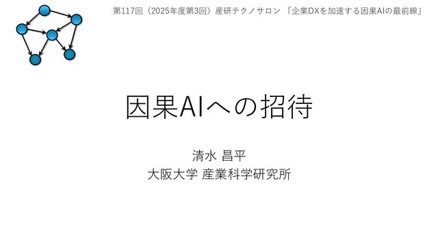 第117回(2025年度第3回)産研テクノサロン 「企業DXを加速する因果AIの最前線」 https://www.sanken.osaka-u.ac.jp/labs/air/techno_salon/2025FY.html#technosalon_r7_3