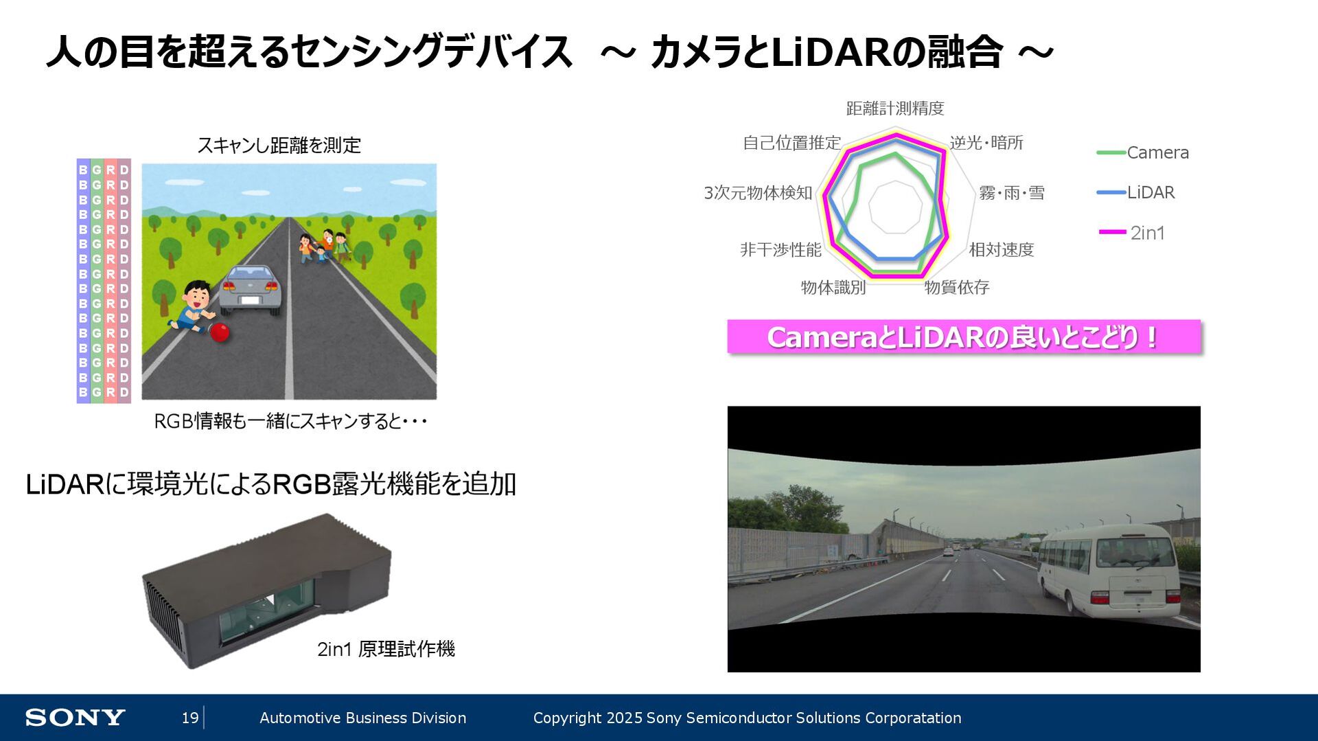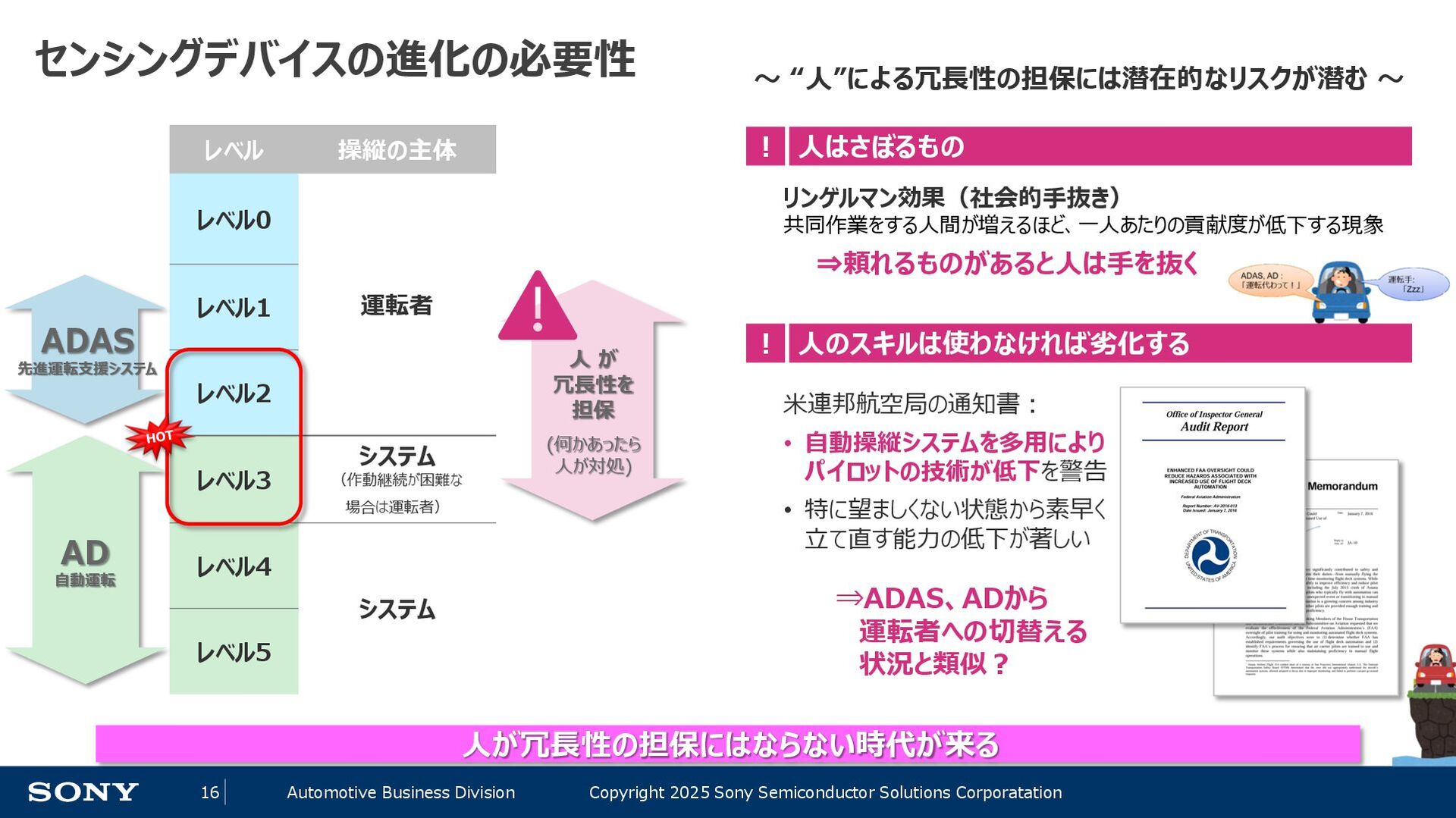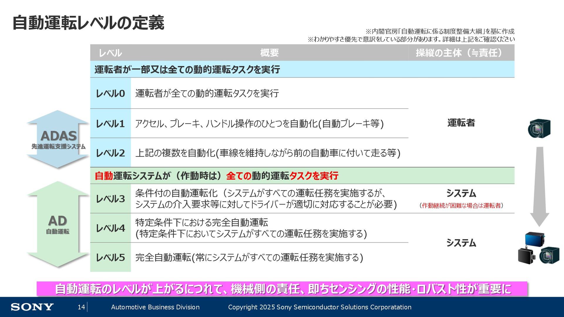 14 Automotive Business Division Copyright 2025 Sony Semiconductor Solutions Corporatation 自動運転レベルの定義 レベル 概要 操縦の主体(≒責任) 運転者が一部又は全ての動的運転タスクを実行 レベル0 運転者が全ての動的運転タスクを実行 運転者 レベル1 アクセル、ブレーキ、ハンドル操作のひとつを自動化(自動ブレーキ等) レベル2 上記の複数を自動化(車線を維持しながら前の自動車に付いて走る等) 自動運転システムが(作動時は)全ての動的運転タスクを実行 レベル3 条件付の自動運転化(システムがすべての運転任務を実施するが、 システムの介入要求等に対してドライバーが適切に対応することが必要) システム (作動継続が困難な場合は運転者) レベル4 特定条件下における完全自動運転 (特定条件下においてシステムがすべての運転任務を実施する) システム レベル5 完全自動運転(常にシステムがすべての運転任務を実施する) ADAS 先進運転支援システム AD 自動運転 自動運転のレベルが上がるにつれて、機械側の責任、即ちセンシングの性能・ロバスト性が重要に ※内閣官房「自動運転に係る制度整備大綱」を基に作成 ※わかりやすさ優先で意訳をしている部分があります。詳細は上記をご確認ください