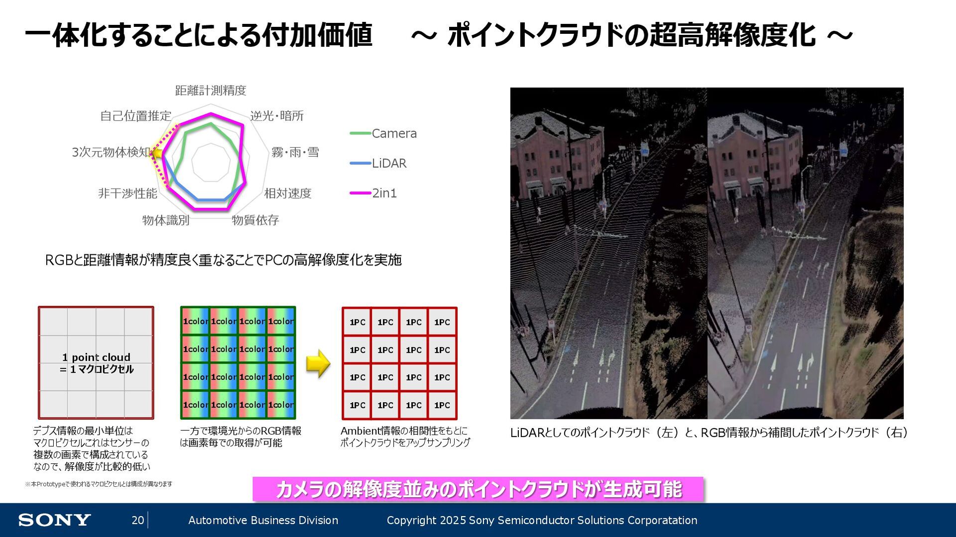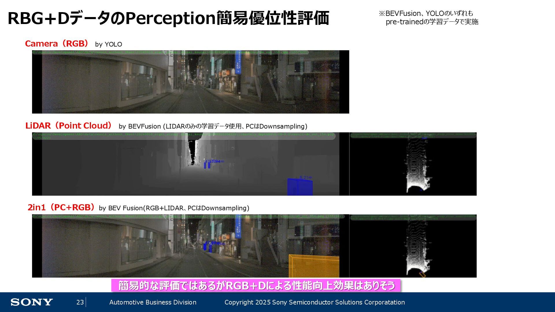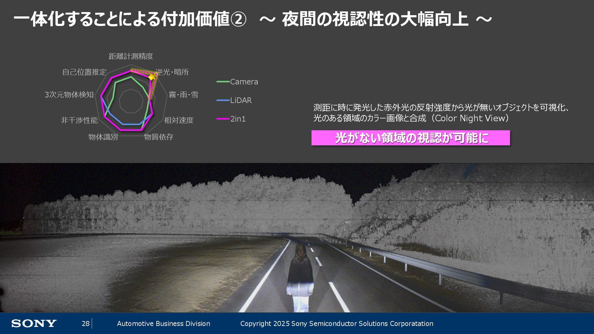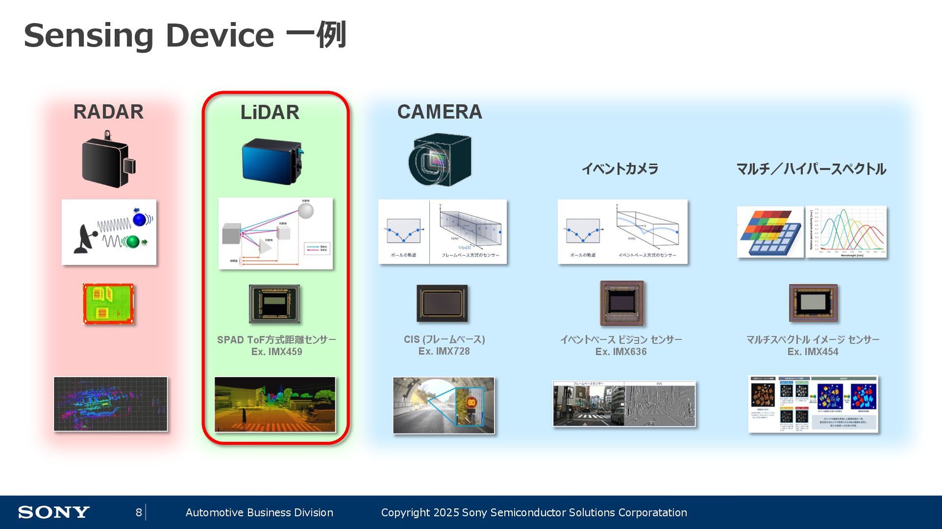 14 Automotive Business Division Copyright 2025 Sony Semiconductor Solutions Corporatation 自動運転レベルの定義 レベル 概要 操縦の主体(≒責任) 運転者が一部又は全ての動的運転タスクを実行 レベル0 運転者が全ての動的運転タスクを実行 運転者 レベル1 アクセル、ブレーキ、ハンドル操作のひとつを自動化(自動ブレーキ等) レベル2 上記の複数を自動化(車線を維持しながら前の自動車に付いて走る等) 自動運転システムが(作動時は)全ての動的運転タスクを実行 レベル3 条件付の自動運転化(システムがすべての運転任務を実施するが、 システムの介入要求等に対してドライバーが適切に対応することが必要) システム (作動継続が困難な場合は運転者) レベル4 特定条件下における完全自動運転 (特定条件下においてシステムがすべての運転任務を実施する) システム レベル5 完全自動運転(常にシステムがすべての運転任務を実施する) ADAS 先進運転支援システム AD 自動運転 自動運転のレベルが上がるにつれて、機械側の責任、即ちセンシングの性能・ロバスト性が重要に ※内閣官房「自動運転に係る制度整備大綱」を基に作成 ※わかりやすさ優先で意訳をしている部分があります。詳細は上記をご確認ください