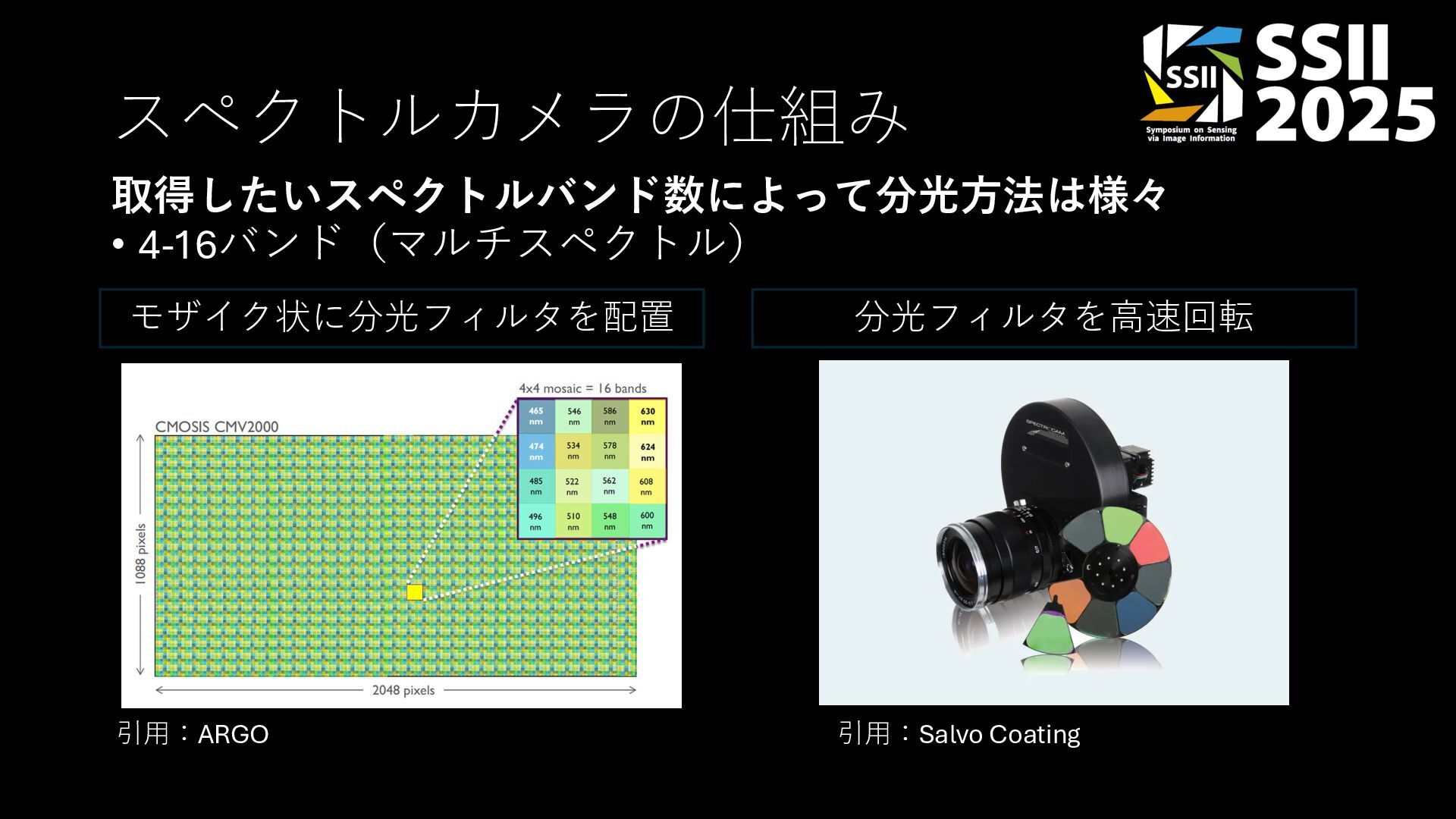スペクトルカメラの仕組み • 4-16バンド(マルチスペクトル) モザイク状に分光フィルタを配置 分光フィルタを⾼速回転 引⽤:ARGO 引⽤:Salvo Coating 取得したいスペクトルバンド数によって分光⽅法は様々