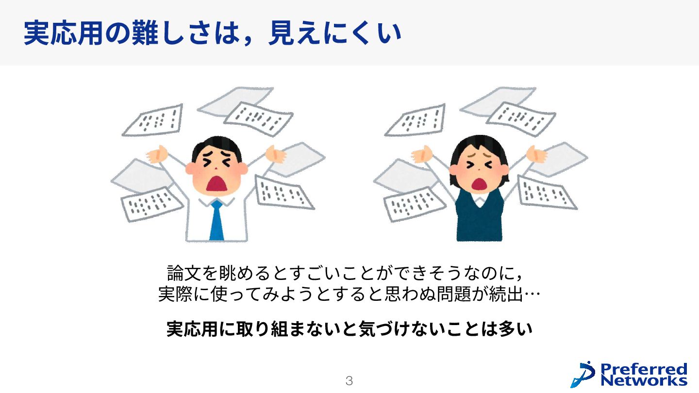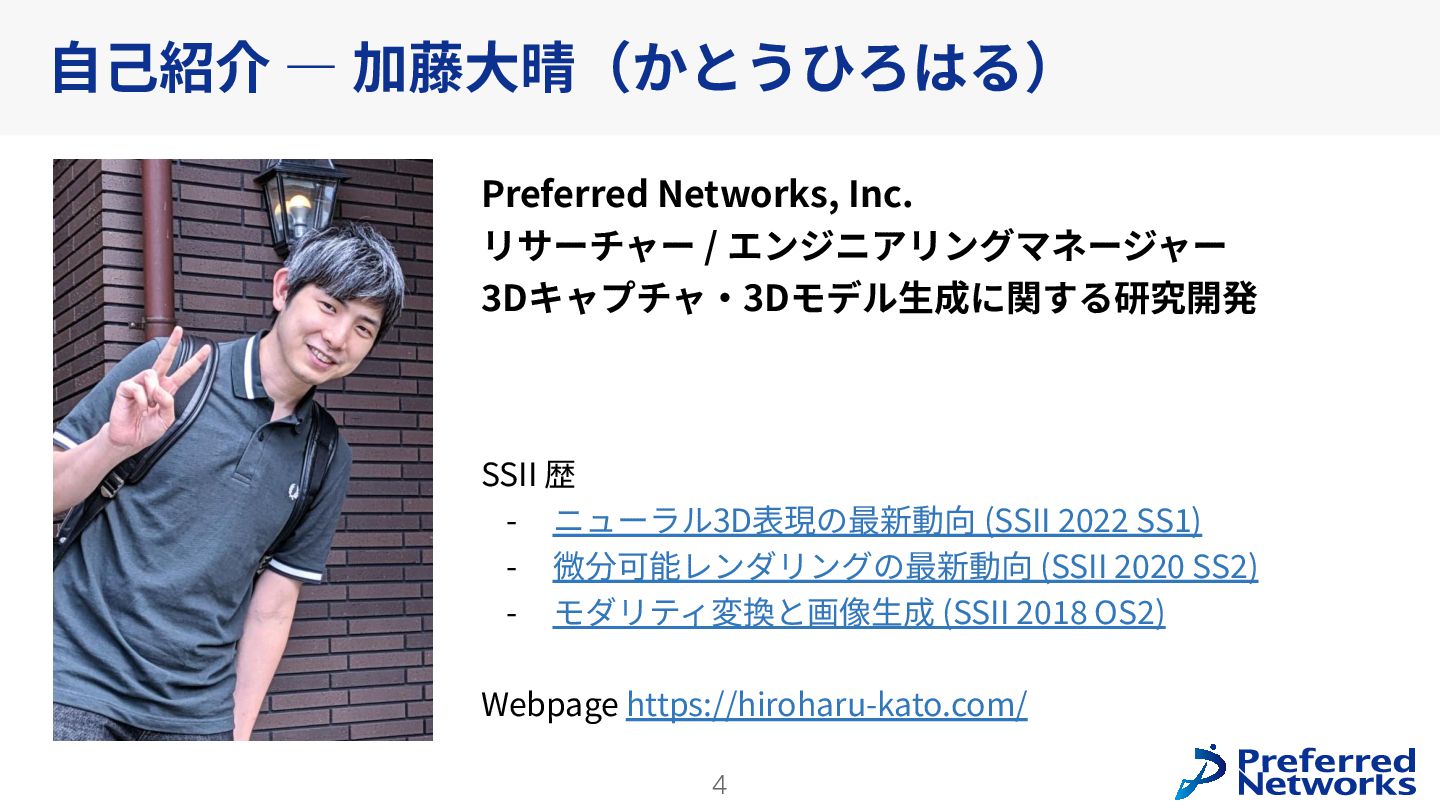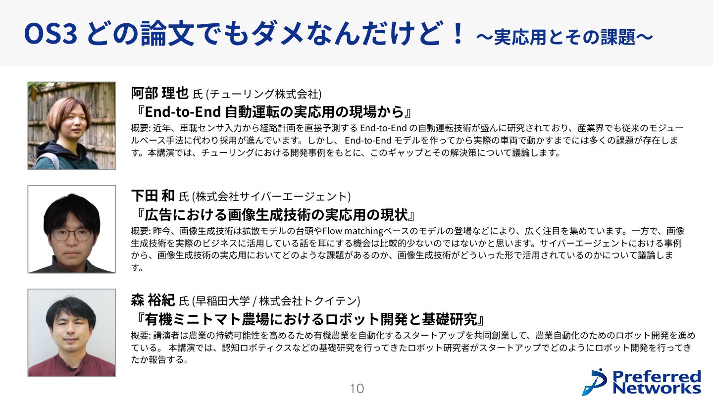 概要: 近年、⾞載センサ⼊⼒から経路計画を直接予測する End-to-End の⾃動運転技術が盛んに研究されており、産業界でも従来のモジュー ルベース⼿法に代わり採⽤が進んでいます。しかし、 End-to-End モデルを作ってから実際の⾞両で動かすまでには多くの課題が存在しま す。本講演では、チューリングにおける開発事例をもとに、このギャップとその解決策について議論します。 下⽥ 和 ⽒ (株式会社サイバーエージェント) 『広告における画像⽣成技術の実応⽤の現状』 概要: 昨今、画像⽣成技術は拡散モデルの台頭やFlow matchingベースのモデルの登場などにより、広く注⽬を集めています。⼀⽅で、画像 ⽣成技術を実際のビジネスに活⽤している話を⽿にする機会は⽐較的少ないのではないかと思います。サイバーエージェントにおける事例 から、画像⽣成技術の実応⽤においてどのような課題があるのか、画像⽣成技術がどういった形で活⽤されているのかについて議論しま す。 森 裕紀 ⽒ (早稲⽥⼤学 / 株式会社トクイテン) 『有機ミニトマト農場におけるロボット開発と基礎研究』 概要: 講演者は農業の持続可能性を⾼めるため有機農業を⾃動化するスタートアップを共同創業して、農業⾃動化のためのロボット開発を進め ている。 本講演では、認知ロボティクスなどの基礎研究を⾏ってきたロボット研究者がスタートアップでどのようにロボット開発を⾏ってき たか報告する。