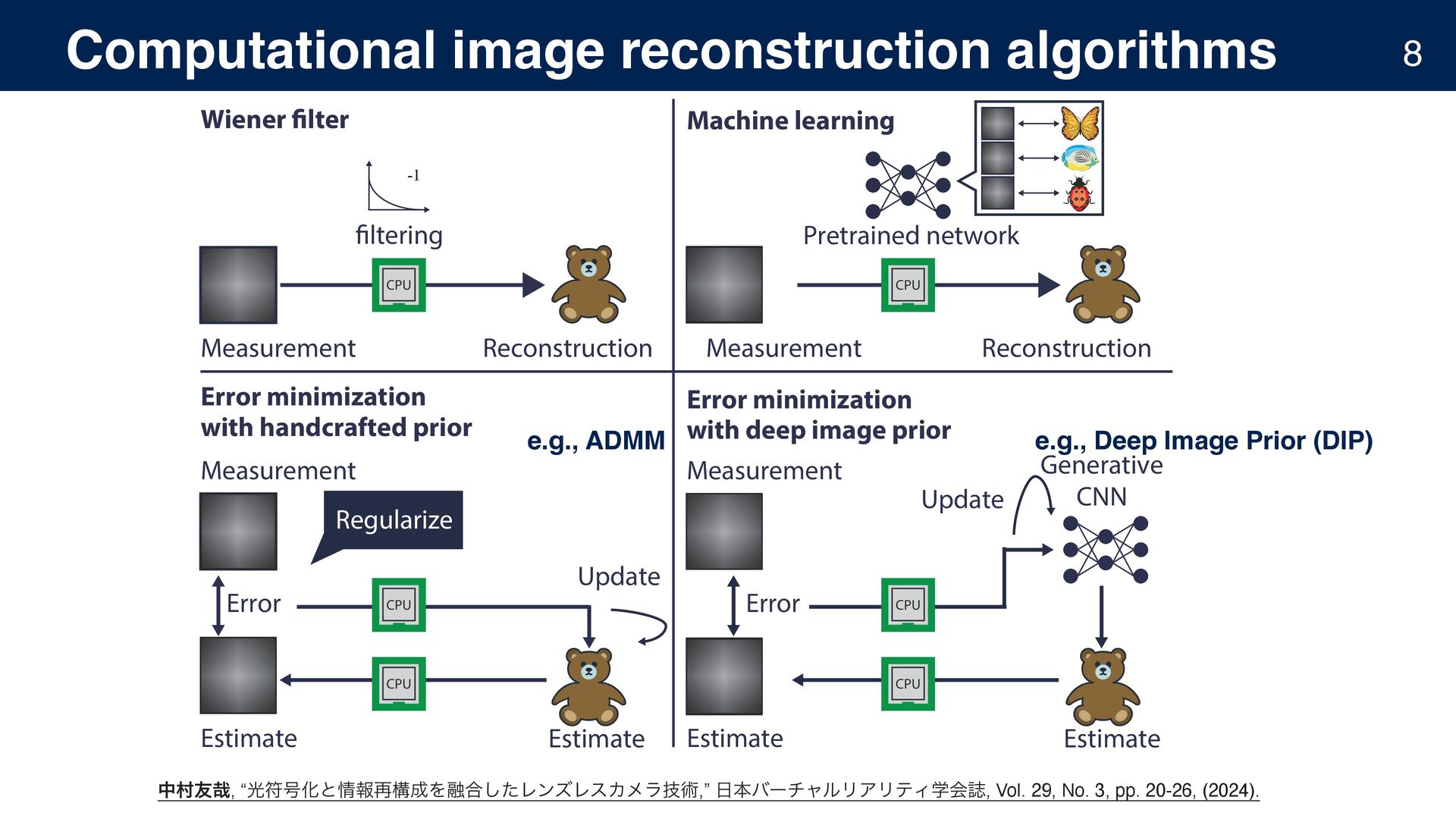 CPU CPU filtering Measurement Measurement Reconstruction Measurement Reconstruction CPU CPU CPU -1 Pretrained network Error minimization with handcrafted prior Error minimization with deep image prior Regularize Error Update Update Estimate Estimate Measurement Error Estimate Estimate Generative CNN e.g., ADMM e.g., Deep Image Prior (DIP) தଜ༑࠸, “ޫූ߸Խͱใ࠶ߏΛ༥߹ͨ͠ϨϯζϨεΧϝϥٕज़,” ຊόʔνϟϧϦΞϦςΟֶձࢽ, Vol. 29, No. 3, pp. 20-26, (2024).