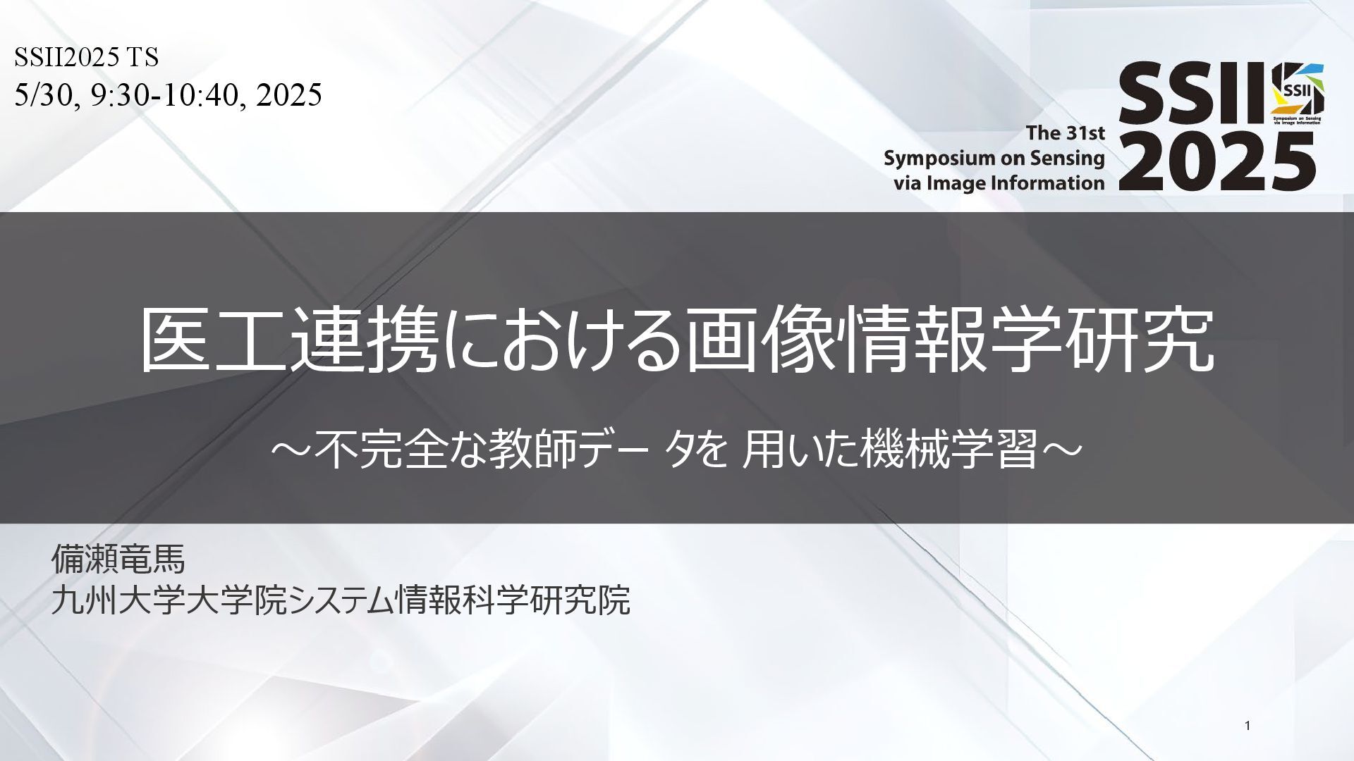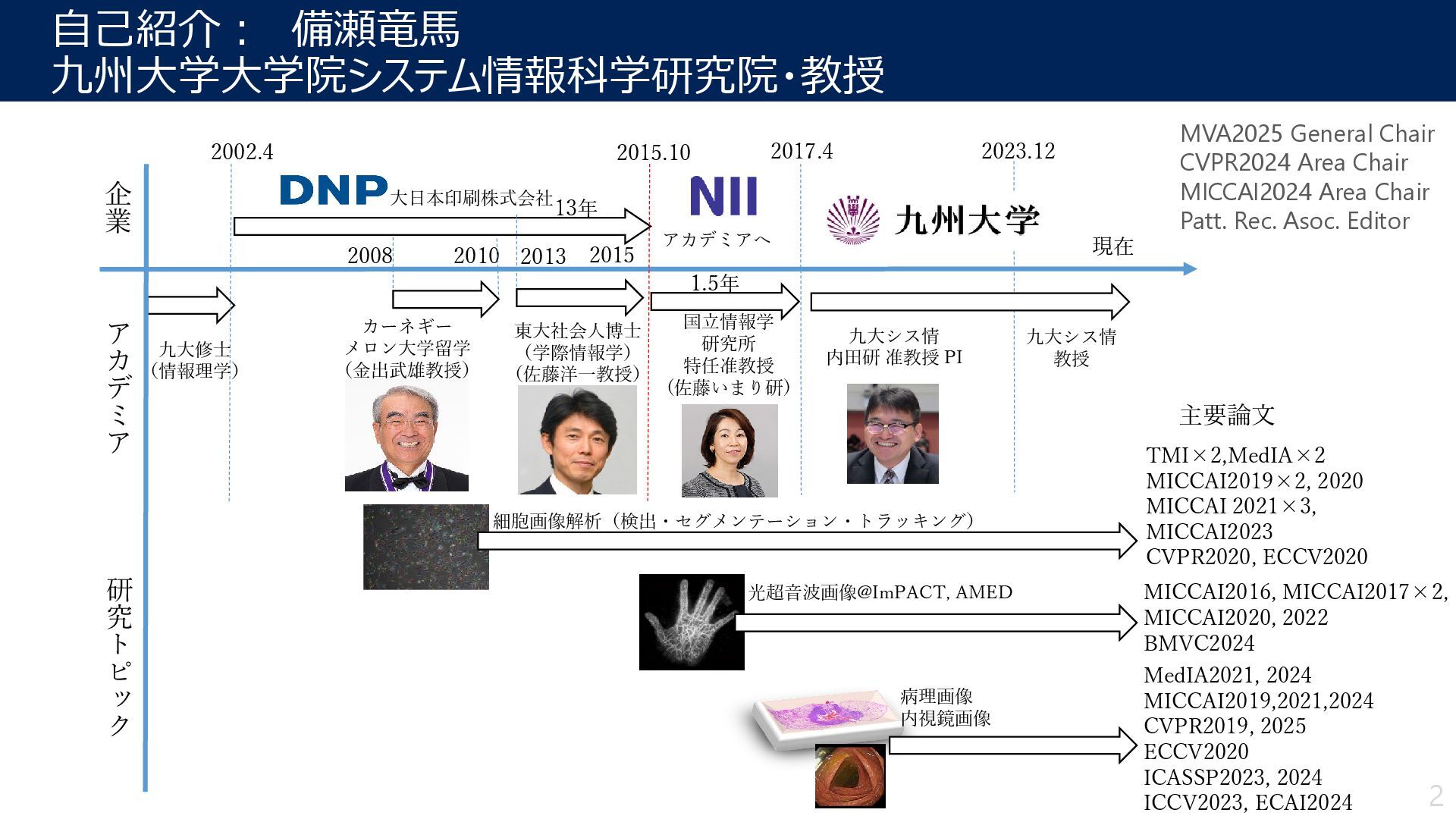 (佐藤洋一教授) カーネギー メロン大学留学 (金出武雄教授) 2002.4 2010 2017.4 2015 2013 国立情報学 研究所 特任准教授 (佐藤いまり研) 九大シス情 内田研 准教授 アカデミアへ 13年 1.5年 現在 細胞画像解析(検出・セグメンテーション・トラッキング) 光超音波画像@ImPACT, AMED 病理画像 内視鏡画像 Optimization, Supervised Learning Efficient Labeled Learning TMI×2,MedIA×2 MICCAI2019×2, 2020 MICCAI 2021×3, MICCAI2023 CVPR2020, ECCV2020 MICCAI2016, MICCAI2017×2, MICCAI2020, 2022 BMVC2024 MedIA2021, 2024 MICCAI2019,2021, 2024 CVPR2019, 2025 ECCV2020 ICASSP2023, 2024 ICCV2023, ECAI2024 主要論文 2023.12 九大シス情 教授 ここ数年の半分以上が 不完全な教師からの学習手法 自己紹介: 備瀬竜馬 九州大学大学院システム情報科学研究院 ア カ デ ミ ア 研 究 ト ピ ッ ク MVA2025 General Chair CVPR2024 Area Chair MICCAI2024 Area Chair