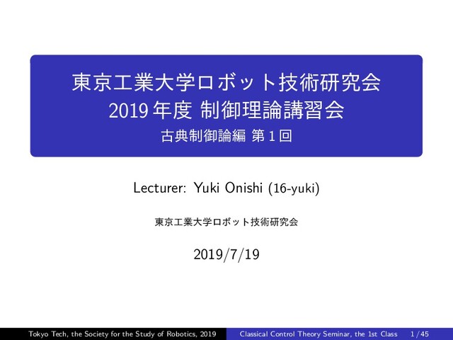 (16-yuki) 東京工業大学ロボット技術研究会 2019/7/19 Tokyo Tech, the Society for the Study of Robotics, 2019 Classical Control Theory Seminar, the 1st Class 1 / 45