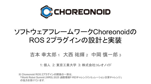 1: 個人 2: 東京工業大学 3: 株式会社コレオノイド ※ Choreonoid ROS 2プラグインの開発の一部は, 「World Robot Summit (WRS) 2025 過酷環境F-REIチャレンジ/シミュレーション災害チャレンジ」 の協力を受けています.