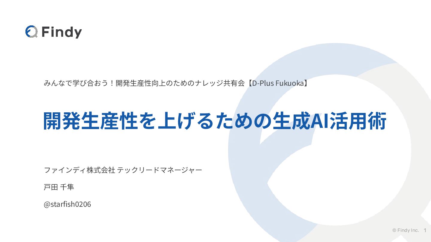 © Findy Inc. みんなで学び合おう!開発⽣産性向上のためのナレッジ共有会【D-Plus Fukuoka】 開発⽣産性を上げるための⽣成AI活⽤術 1 ファインディ株式会社 テックリードマネージャー ⼾⽥