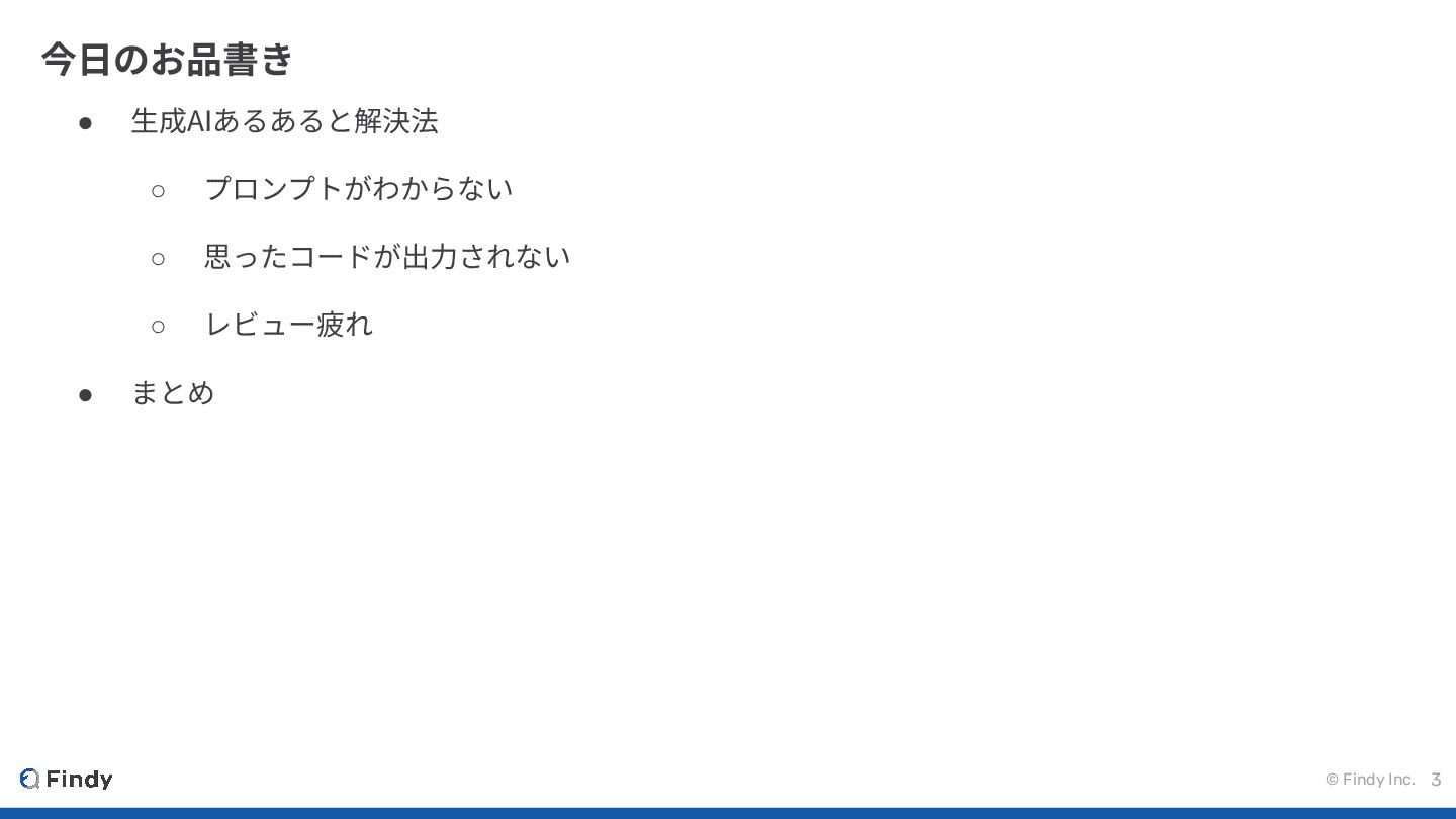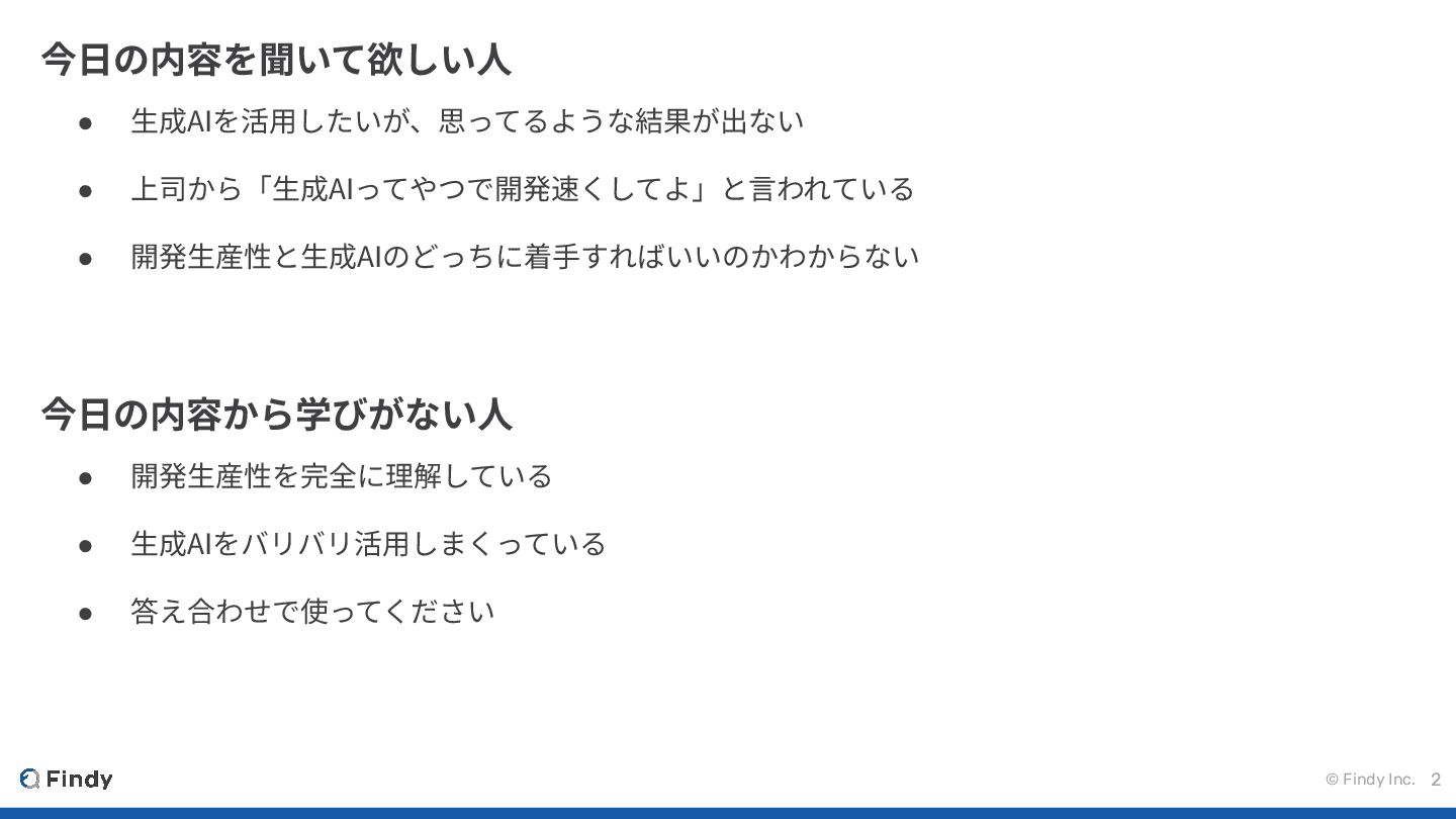 © Findy Inc. 2 今⽇の内容を聞いて欲しい⼈ • ⽣成AIを活⽤したいが、思ってるような結果が出ない • 上司から「⽣成AIってやつで開発速くしてよ」と⾔われている •