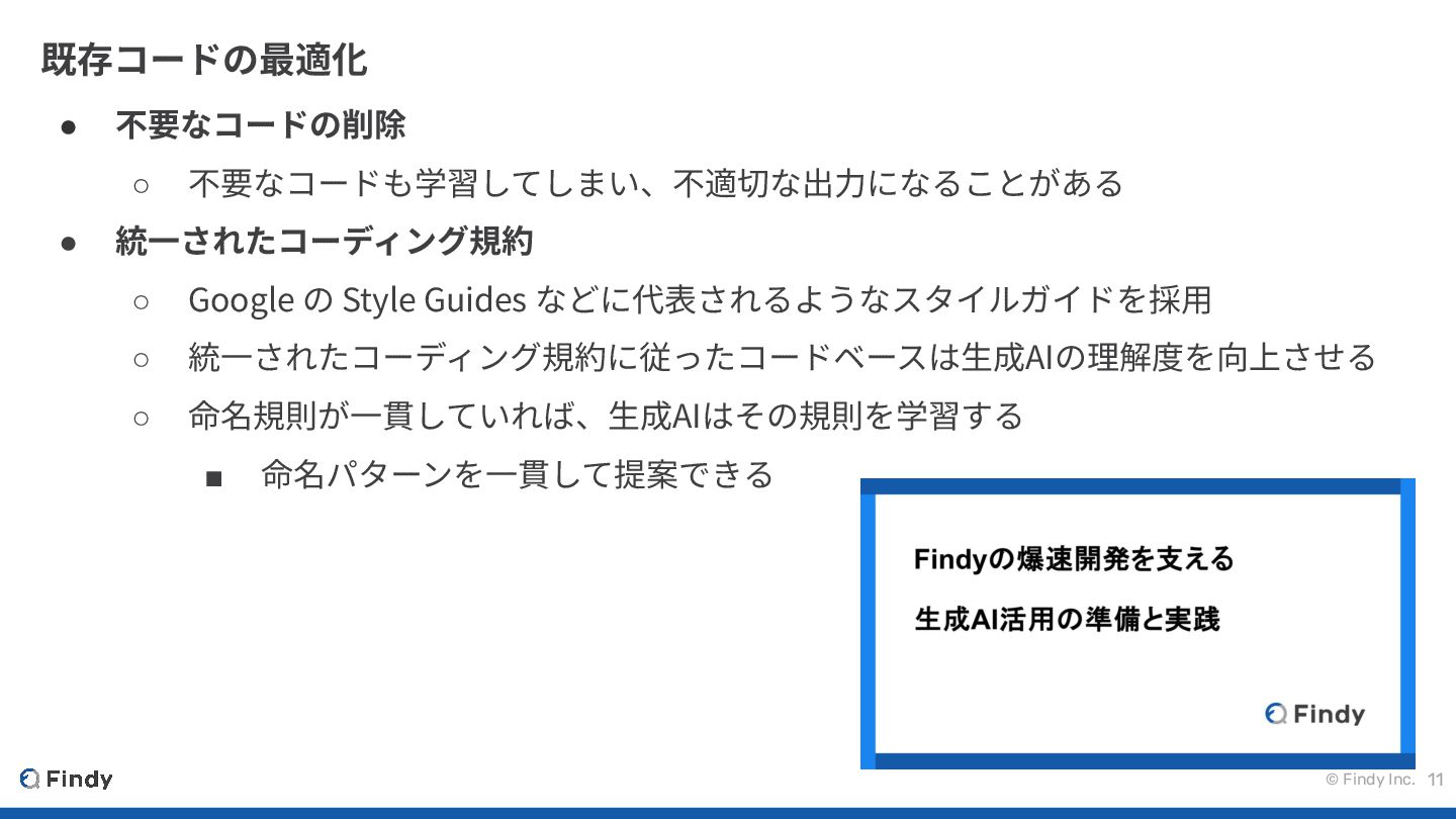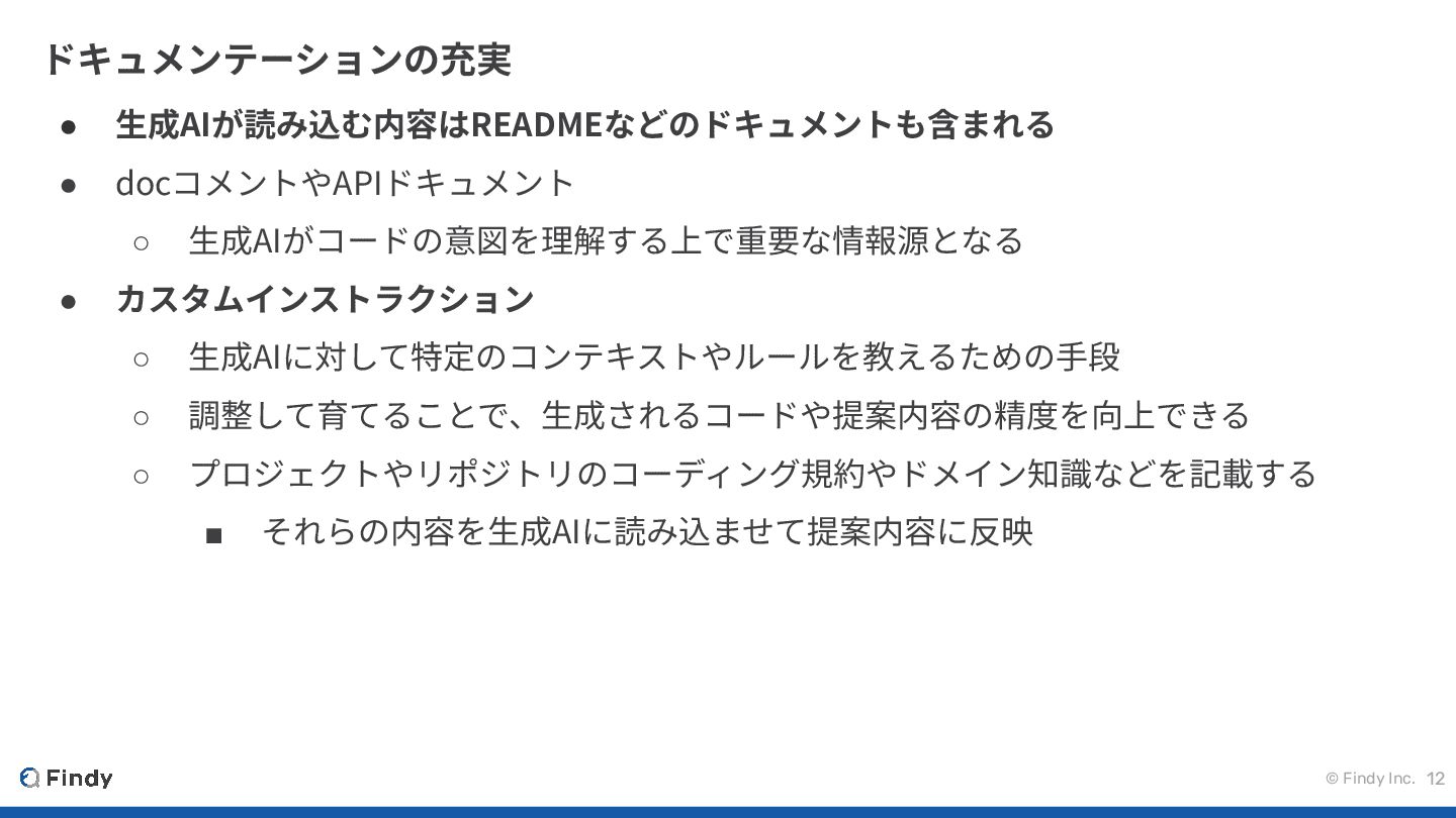 © Findy Inc. 11 既存コードの最適化 • 不要なコードの削除 ◦ 不要なコードも学習してしまい、不適切な出⼒になることがある •