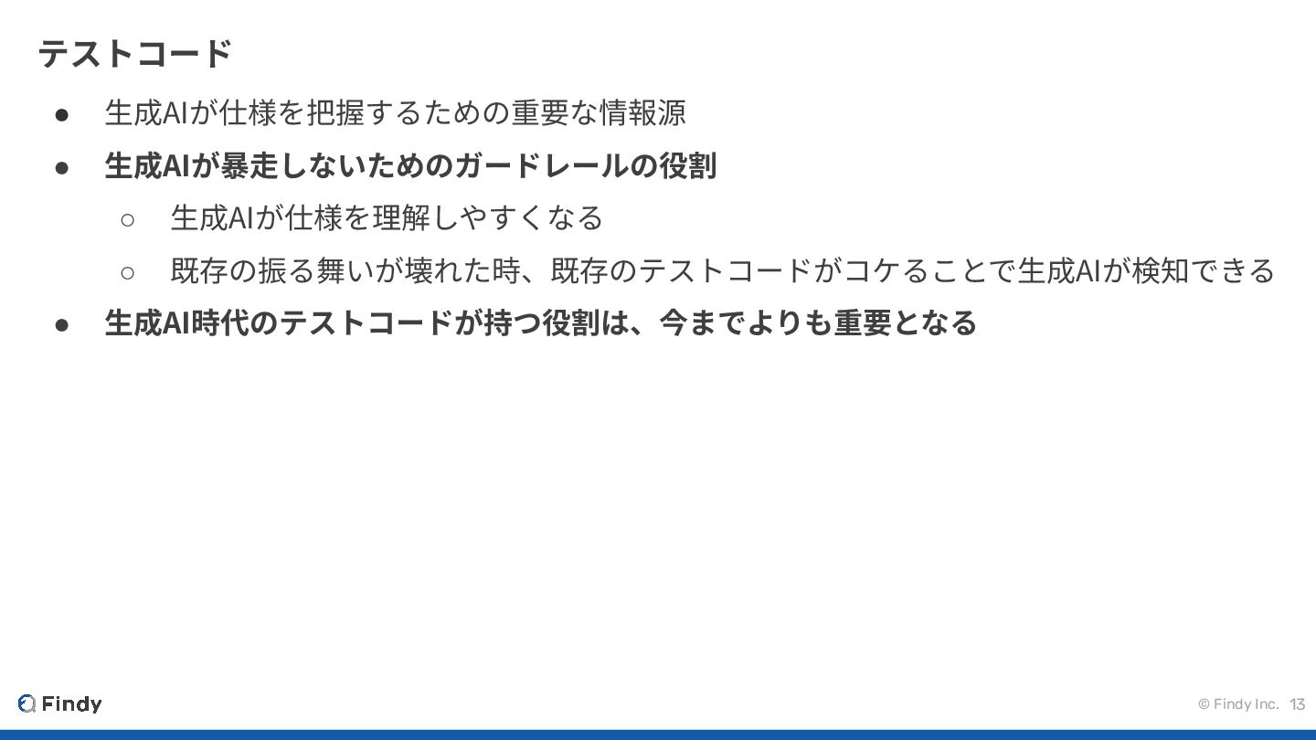 © Findy Inc. 13 テストコード • ⽣成AIが仕様を把握するための重要な情報源 • ⽣成AIが暴⾛しないためのガードレールの役割 ◦