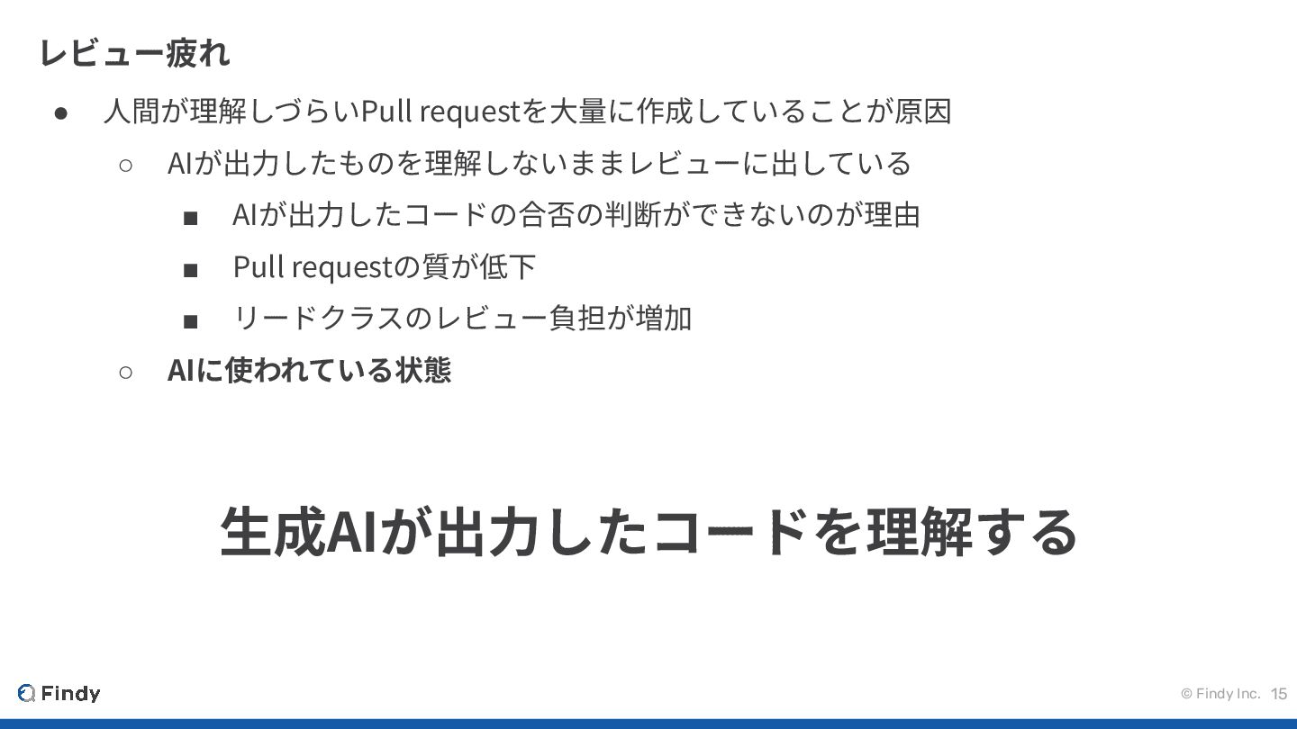 © Findy Inc. 15 レビュー疲れ • ⼈間が理解しづらいPull requestを⼤量に作成していることが原因 ◦ AIが出⼒したものを理解しないままレビューに出している