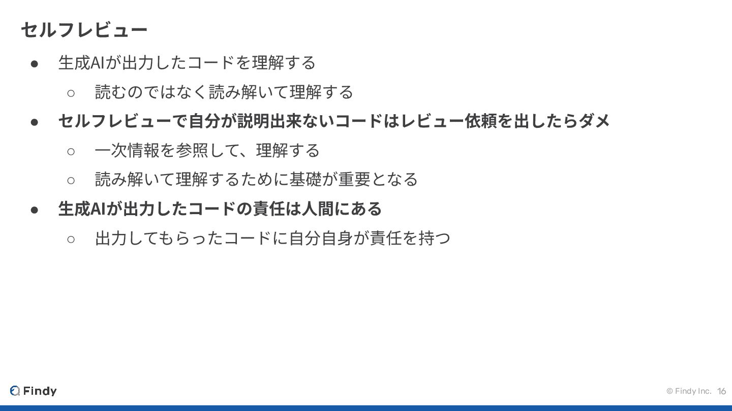 セルフレビューで⾃分が説明出来ないコードはレビュー依頼を出したらダメ ◦ ⼀次情報を参照して、理解する ◦ 読み解いて理解するために基礎が重要となる • ⽣成AIが出⼒したコードの責任は⼈間にある ◦ 出⼒してもらったコードに⾃分⾃⾝が責任を持つ