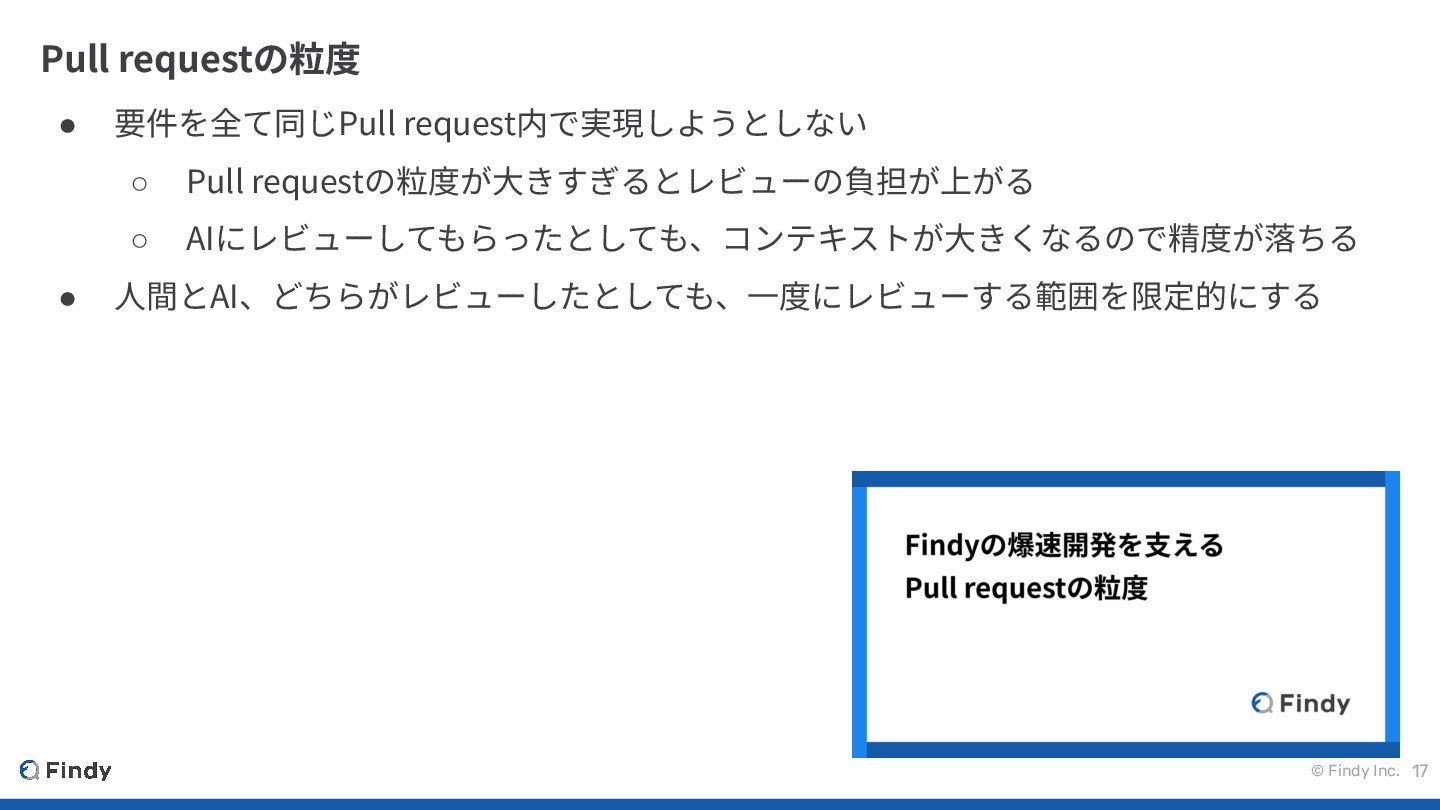 Pull requestの粒度が⼤きすぎるとレビューの負担が上がる ◦ AIにレビューしてもらったとしても、コンテキストが⼤きくなるので精度が落ちる • ⼈間とAI、どちらがレビューしたとしても、⼀度にレビューする範囲を限定的にする