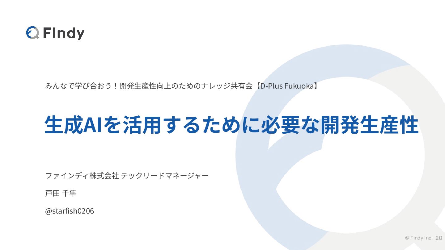 © Findy Inc. みんなで学び合おう!開発⽣産性向上のためのナレッジ共有会【D-Plus Fukuoka】 ⽣成AIを活⽤するために必要な開発⽣産性 20 ファインディ株式会社 テックリードマネージャー ⼾⽥