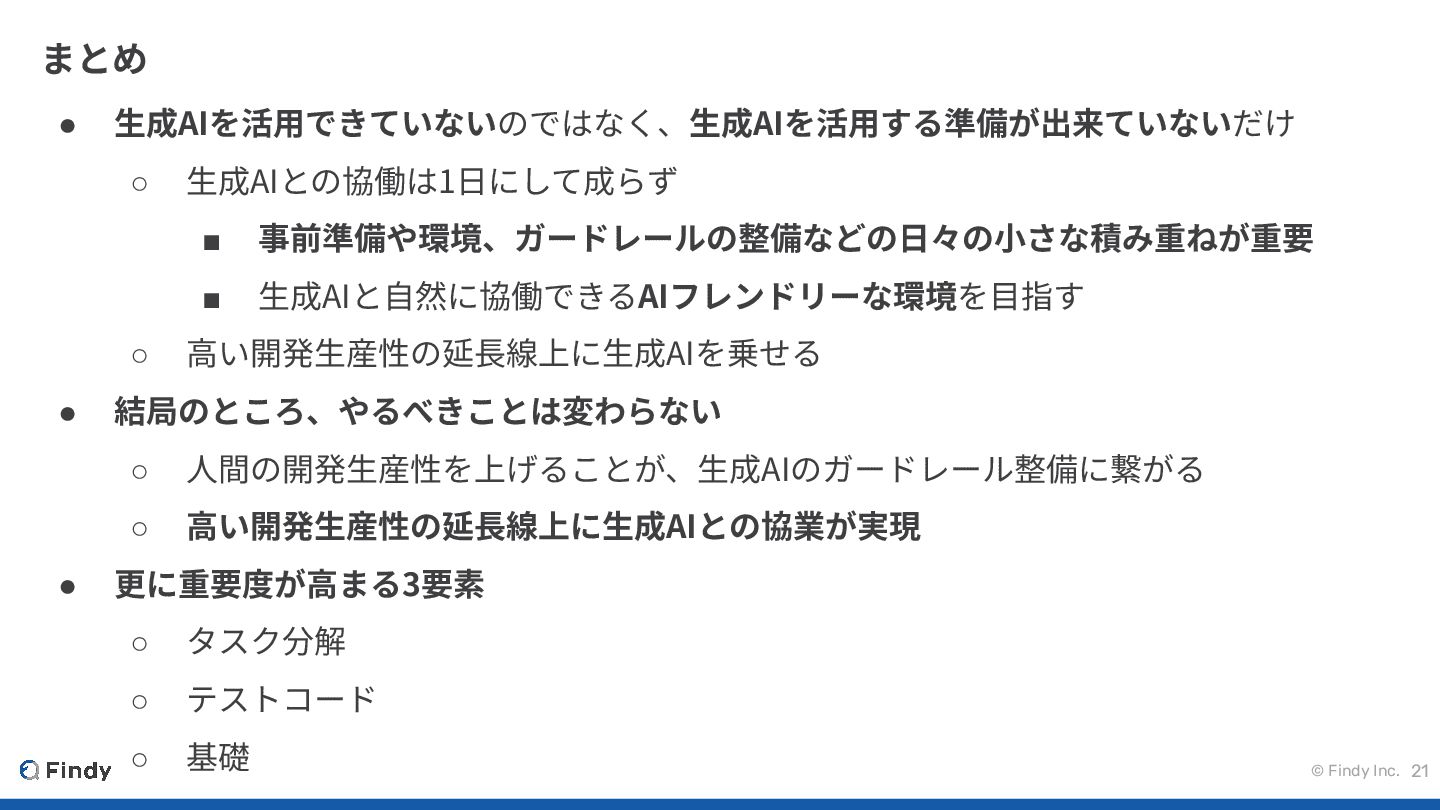 © Findy Inc. まとめ 21 • ⽣成AIを活⽤できていないのではなく、⽣成AIを活⽤する準備が出来ていないだけ ◦ ⽣成AIとの協働は1⽇にして成らず ▪