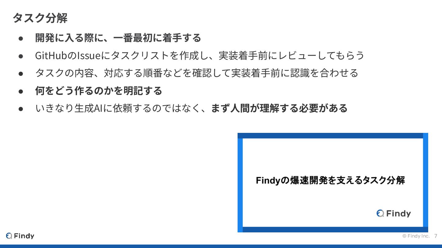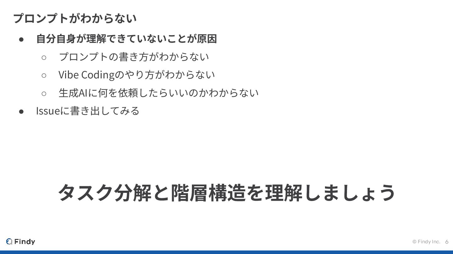 © Findy Inc. 6 プロンプトがわからない • ⾃分⾃⾝が理解できていないことが原因 ◦ プロンプトの書き⽅がわからない ◦