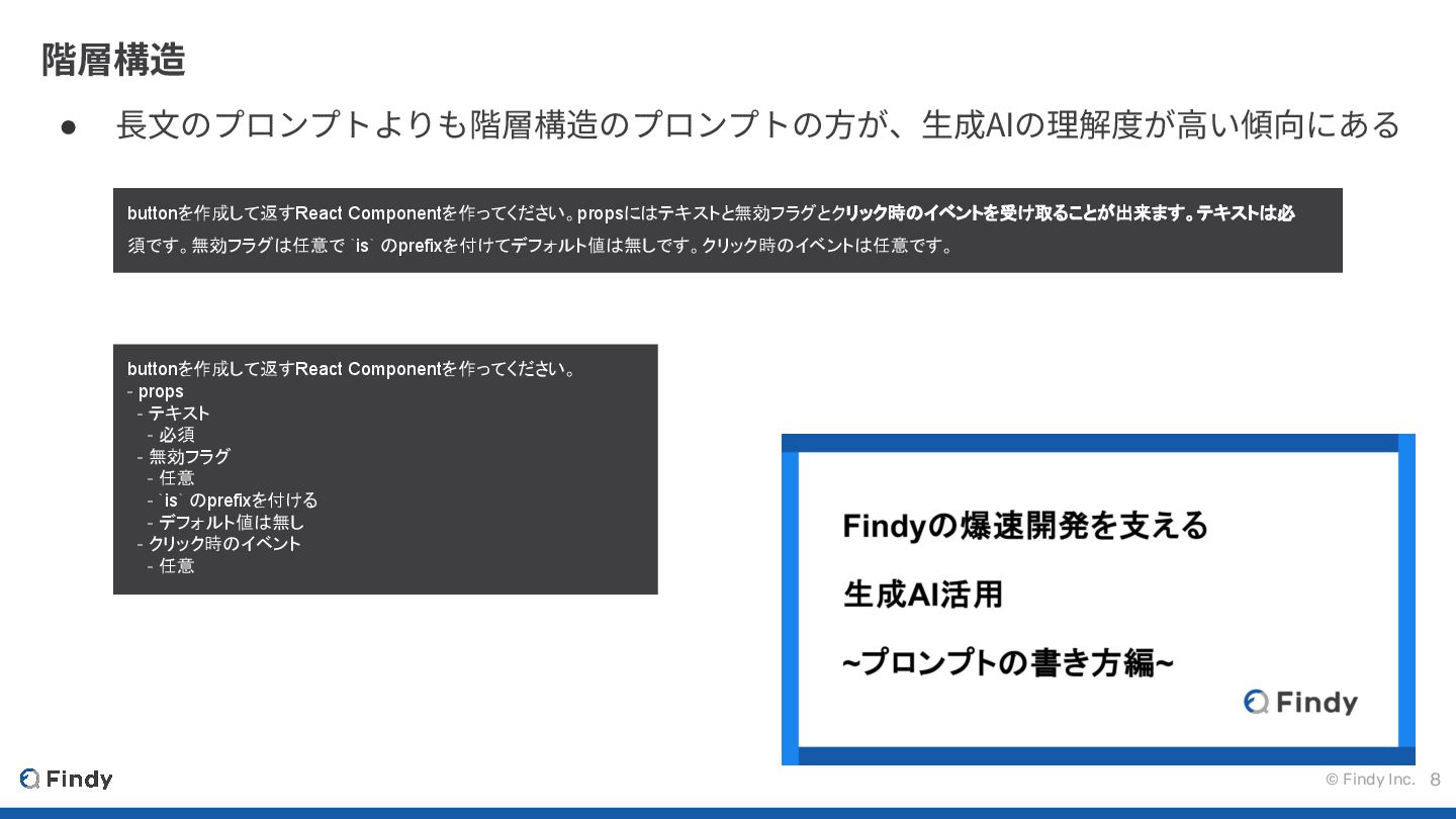 © Findy Inc. 8 階層構造 • ⻑⽂のプロンプトよりも階層構造のプロンプトの⽅が、⽣成AIの理解度が⾼い傾向にある buttonを作成して返すReact Componentを作ってください。propsにはテキストと無効フラグとクリック時のイベントを受け取ることが出来ます。テキストは必 須です。無効フラグは任意で