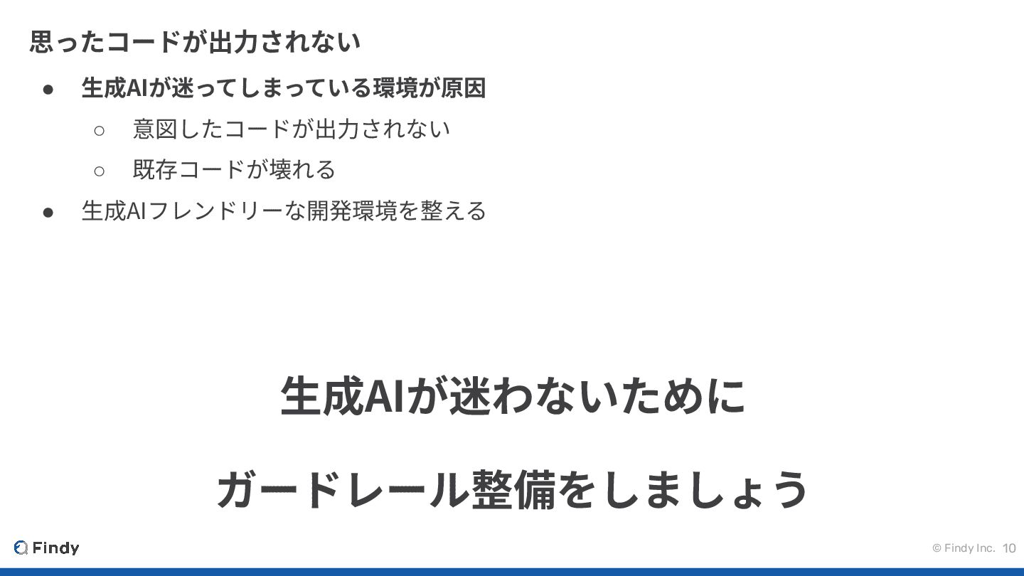 © Findy Inc. 10 思ったコードが出⼒されない • ⽣成AIが迷ってしまっている環境が原因 ◦ 意図したコードが出⼒されない ◦